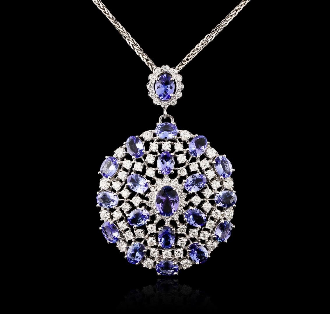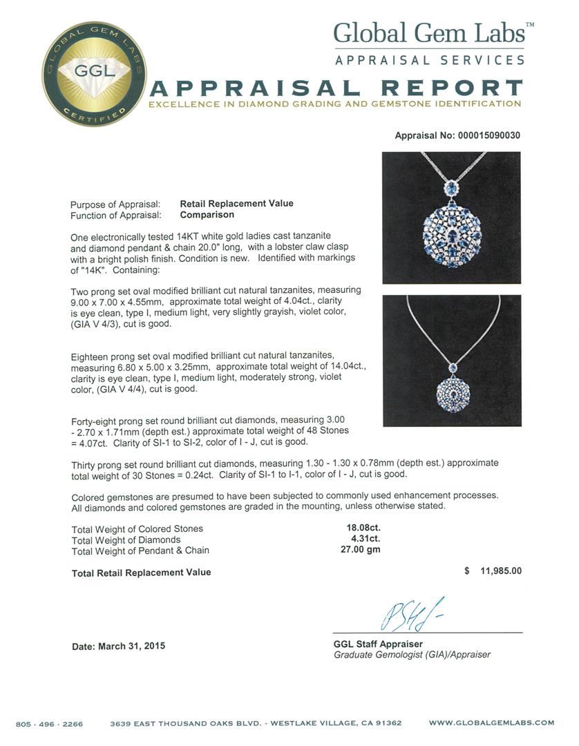 One electronically tested 14KT white gold ladies cast tanzanite and diamond pendant & chain 20.0" long, with a lobster claw clasp with a bright polish finish. Identified with markings of "14K". Condition is new. Containing: Two prong set oval modified brilliant cut natural tanzanites, measuring 9.00. x 7.00. x 4.55mm, approximate total weight of 4.04ct., clarity is eye clean, type I, medium light, very slightly grayish, violet color, (GIA V 4/3), cut is good. Eighteen prong set oval modified brilliant cut natural tanzanites, measuring 6.80 x 5.00. x 3.25mm, approximate total weight of 14.04ct., clarity is eye clean, type I, medium light, moderately strong, violet color, (GIA V 4/4), cut is good. Forty-Eight prong set round brilliant cut diamonds, measuring 3.00. - 2.70 x 1.71mm (depth est.) approximate total weight of 48 Stones = 4.07ct. Clarity: SI-1 to SI-2. Color: I - J, Cut is Good. Thirty prong set round brilliant cut diamonds, measuring 1.30 - 1.30 x 0.78mm (depth est.) approximate total weight of 30 Stones = 0.24ct. Clarity: SI-1 to I-1. Color: I - J, Cut is Good. Colored gemstones are presumed to have been subjected to commonly used enhancement processes. All diamonds and colored gemstones are graded in the mounting, unless otherwise stated. Total Weight of Colored Stones 18.08ct. Total Weight of Diamonds 4.31ct. Total Weight of Pendant & Chain 27.00 grams. GGL Appraised at $11,985.00.