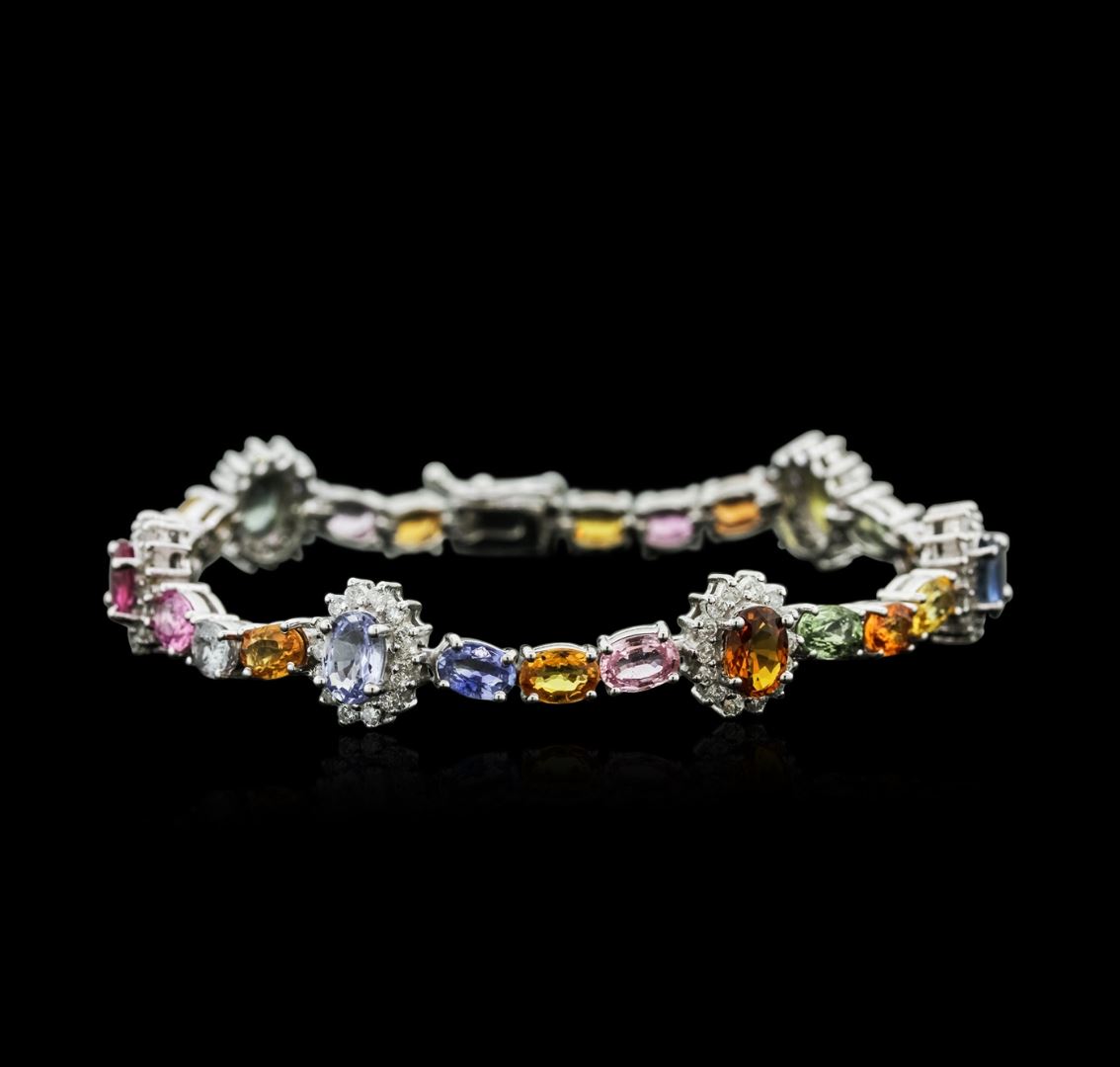 One polished, stamped, and tested 14K white gold bracelet mounted with: 27 genuine sapphires weighing 18.15 carats, and 84 genuine round diamonds weighing 1.70 carats. The bracelet measures 7.5 inches in length and is finished with a tension lock clasp and safety clasp. This item weighs 21.1 grams, condition is new, excellent workmanship. MAIN GEMSTONES: Species: Natural Corundum. Variety: Sapphire / Fancy Color Sapphire. Shape: Oval. Cutting Style: Brilliant Cut Crown Step Cut Pavilion. Quantity: 27 Sapphires. Measurements: 6 x 4 - 7 x 5 mm. Total Weight: 18.15 carats. Color: Blue / Pink / Yellow / Orange / Green. Refractive Index: 1.762 - 1.770 DR. Birefringence: 0.08 - 0.010. Hardness: 9. ADJACENT GEMSTONES ON BRACELET: Identity: Natural Diamond. Cut: Round Brilliant. Quantity: 84 Diamonds. Measurements: 1.7 mm. Total Weight: 1.70 carats. Clarity Grade: SI1 - SI3. Color Grade: G - I. Refractive Index: 2.418. Hardness: 10. Total Sapphire Weight: 18.15 cts. Total Diamond Weight: 1.70 cts. Weight of Item: 21.1 grams. Gold Content: 14K White Gold. AIGL Appraised at $16,485.00.
