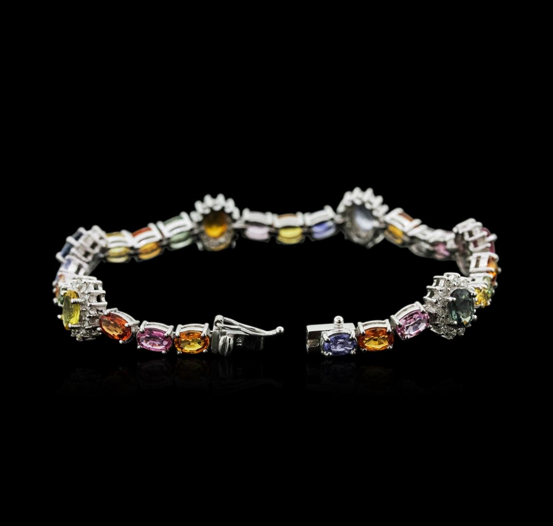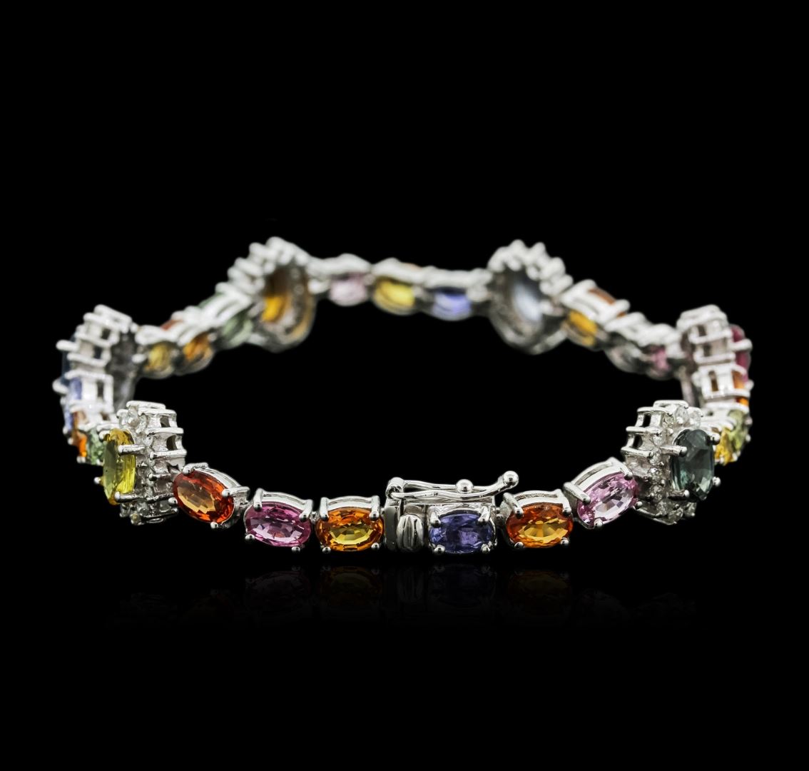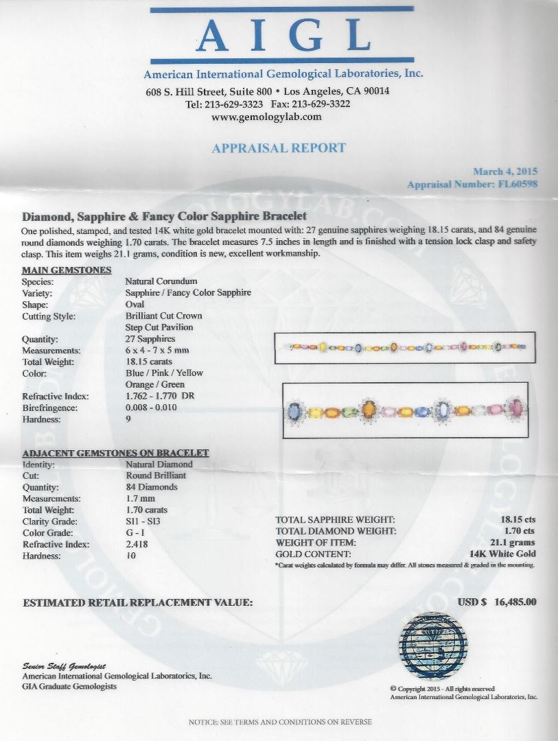 One polished, stamped, and tested 14K white gold bracelet mounted with: 27 genuine sapphires weighing 18.15 carats, and 84 genuine round diamonds weighing 1.70 carats. The bracelet measures 7.5 inches in length and is finished with a tension lock clasp and safety clasp. This item weighs 21.1 grams, condition is new, excellent workmanship. MAIN GEMSTONES: Species: Natural Corundum. Variety: Sapphire / Fancy Color Sapphire. Shape: Oval. Cutting Style: Brilliant Cut Crown Step Cut Pavilion. Quantity: 27 Sapphires. Measurements: 6 x 4 - 7 x 5 mm. Total Weight: 18.15 carats. Color: Blue / Pink / Yellow / Orange / Green. Refractive Index: 1.762 - 1.770 DR. Birefringence: 0.08 - 0.010. Hardness: 9. ADJACENT GEMSTONES ON BRACELET: Identity: Natural Diamond. Cut: Round Brilliant. Quantity: 84 Diamonds. Measurements: 1.7 mm. Total Weight: 1.70 carats. Clarity Grade: SI1 - SI3. Color Grade: G - I. Refractive Index: 2.418. Hardness: 10. Total Sapphire Weight: 18.15 cts. Total Diamond Weight: 1.70 cts. Weight of Item: 21.1 grams. Gold Content: 14K White Gold. AIGL Appraised at $16,485.00.