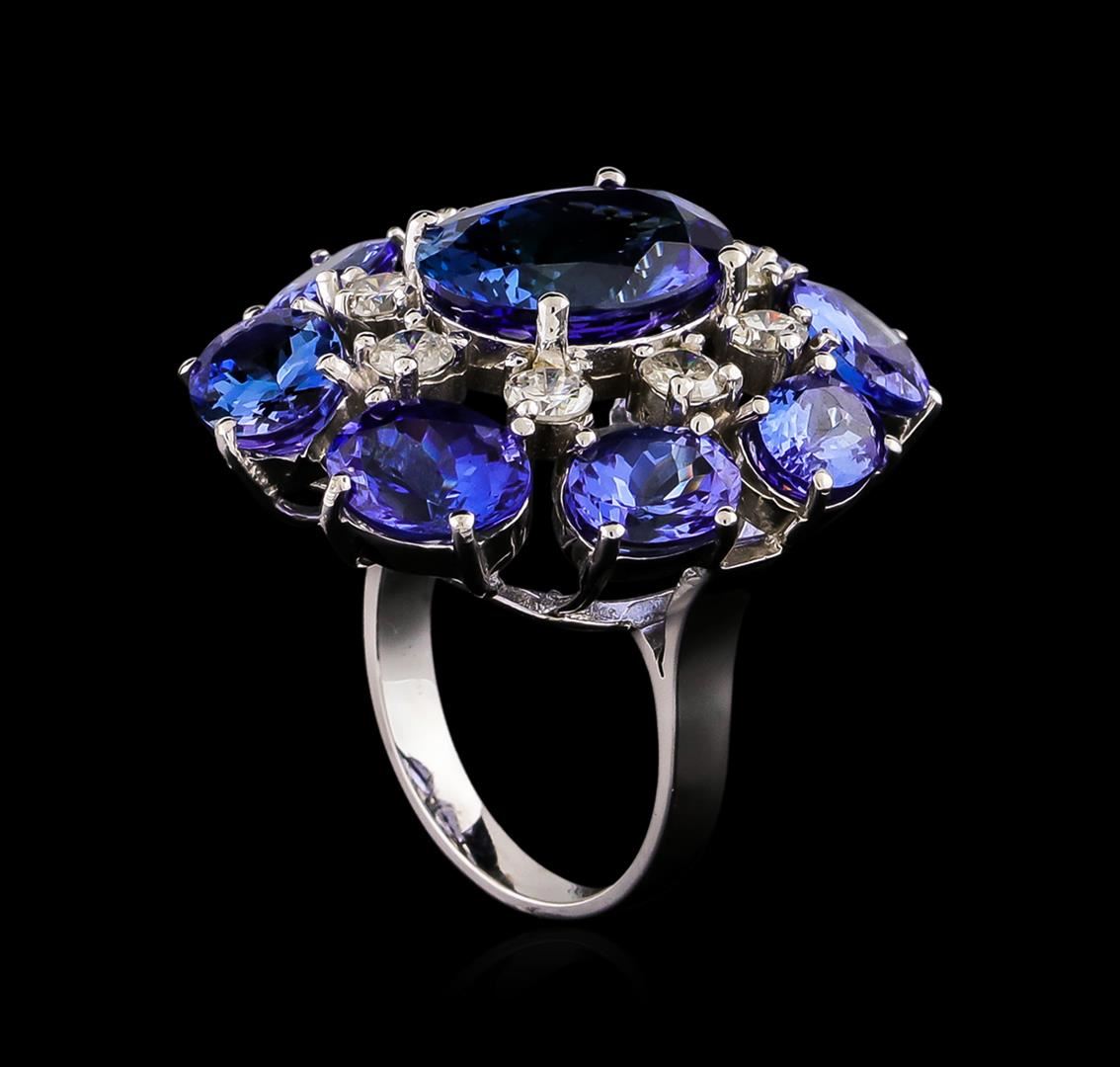 One electronically tested 14KT white gold Ladies cast ring with a bright polish finish. Condition is new. Identified with markings of "K14". Containing: One prong set oval modified brilliant cut natural tanzanite, measuring 13.20 x 9.80 x 6.43mm, approximate weight of 5.70ct., clarity is eye clean, type I, medium, moderately strong, bluish violet color, (GIA bV 5/4), cut is good. Eight prong set round brilliant cut diamonds, measuring 3.40 - 3.40 x 2.04mm (depth est.) approximate. Total Weight of 8 Stones = 1.15ct. Clarity: SI-2 to I-1. Color: J - K, Cut is Good. All grading of diamonds and colored gemstones in this piece of jewelry are graded in the mounting, unless otherwise stated. Eight prong set oval modified brilliant cut natural tanzanites, measuring 8.60 x 6.50 x 4.23mm, approximate. Total Weight of 12.96ct., clarity is eye clean, type I, medium, moderately strong, bluish violet color, (GIA bV 5/4), cut is very good. Colored gemstones are presumed to have been subjected to commonly used color/clarity enhancement processes. Total Weight of Colored Stones 18.66ct. Total Weight of Diamonds 1.15ct. Total Weight of Ring 12.70 grams. GGL Appraised at $16,820.00.