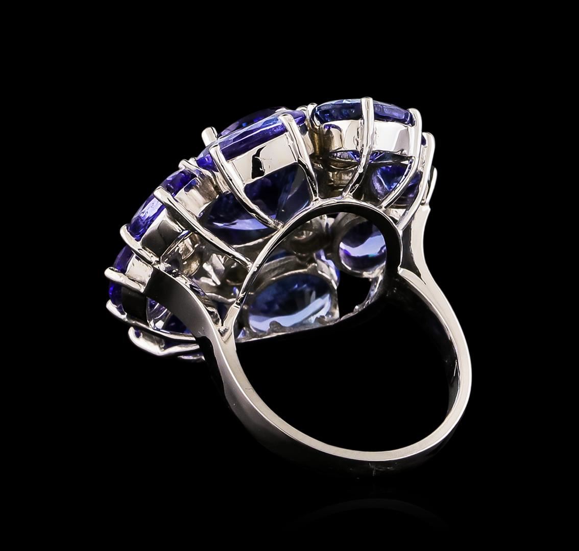 One electronically tested 14KT white gold Ladies cast ring with a bright polish finish. Condition is new. Identified with markings of "K14". Containing: One prong set oval modified brilliant cut natural tanzanite, measuring 13.20 x 9.80 x 6.43mm, approximate weight of 5.70ct., clarity is eye clean, type I, medium, moderately strong, bluish violet color, (GIA bV 5/4), cut is good. Eight prong set round brilliant cut diamonds, measuring 3.40 - 3.40 x 2.04mm (depth est.) approximate. Total Weight of 8 Stones = 1.15ct. Clarity: SI-2 to I-1. Color: J - K, Cut is Good. All grading of diamonds and colored gemstones in this piece of jewelry are graded in the mounting, unless otherwise stated. Eight prong set oval modified brilliant cut natural tanzanites, measuring 8.60 x 6.50 x 4.23mm, approximate. Total Weight of 12.96ct., clarity is eye clean, type I, medium, moderately strong, bluish violet color, (GIA bV 5/4), cut is very good. Colored gemstones are presumed to have been subjected to commonly used color/clarity enhancement processes. Total Weight of Colored Stones 18.66ct. Total Weight of Diamonds 1.15ct. Total Weight of Ring 12.70 grams. GGL Appraised at $16,820.00.