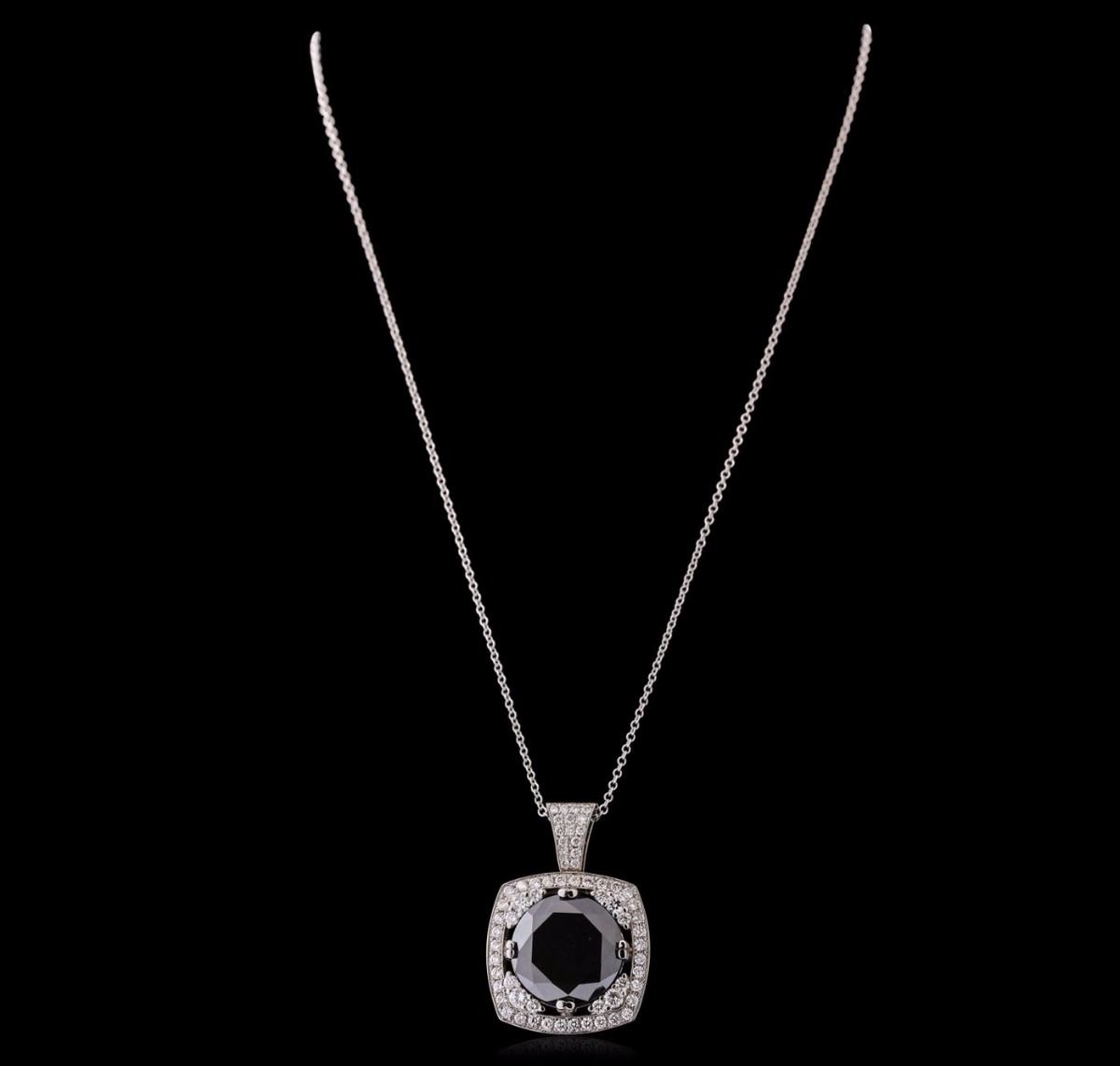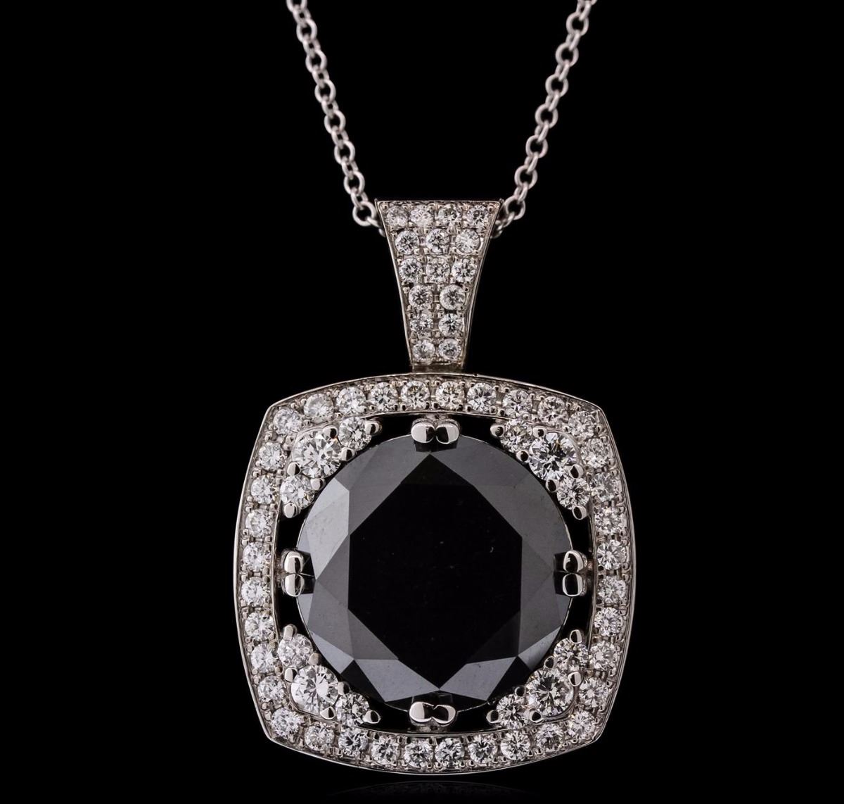 One electronically tested 14KT white gold ladies cast & assembled black and white diamond pendant with chain. The pendant features a black diamond set within a white diamond bezel, completed by a white diamond set bail. The pendant is supported by a sixteen inch length 14KT white gold designer style link chain, terminating in a lobster claw clasp. Bright polish finish. Identified with markings of "14K". Condition is good. Containing: One prong set round brilliant cut diamond, measuring 17.00 - 16.90 x 8.90mm (depth est.), 8.00% GTCF approximate weight of 16.94ct. Indications of multiple laboratory enhancements. The specific gravity of black diamond is 3.120 to 3.165. Diamond tester results are non-reactive. Graded in the setting. Clarity Declasse. Color: Fancy Black; Irradiated. Depth: 52.5%. Table: 67.8%. Sixty-One prong set round brilliant cut diamonds, measuring 1.90 - 1.70 x 1.08mm (depth est.) approximate total weight of 61 Stones = 1.40ct. Graded in the setting. Clarity: VS-2 to SI-2. Color: G - I Four prong set round brilliant cut diamonds, measuring 3.10 - 3.00 x 1.83mm (depth est.) approximate total weight of 4 Stones = 0.50ct. Graded in the setting. Clarity: SI-1 to SI-2. Color: H - I. Total Weight of Diamonds 18.84ct. Total Weight of Pendant With Chain 17.47 grams. AIG Appraised at $18,680.00.