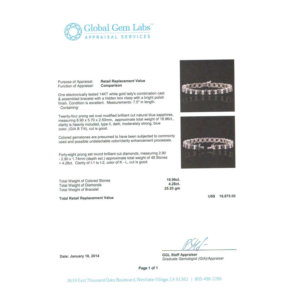 One electronically tested 14KT white gold Ladies combination cast & assembled bracelet with a hidden box clasp with a bright polish finish. Measurements: 7.5" in length. Condition is excellent. Containing: Twenty-four prong set oval modified brilliant cut natural blue sapphires, measuring 6.90 x 5.70 x 2.50mm, approximate total weight of 18.96ct., clarity is heavily included, type II, dark, moderately strong, blue color, (GIA B 7/4), cut is good. Colored gemstones are presumed to have been subjected to commonly used and possible undetectable color/clarity enhancement processes. Forty-Eight prong set round brilliant cut diamonds, measuring 2.90 - 2.90 x 1.74mm (depth est.) approximate total weight of 48 Stones = 4.28ct. Clarity of I-1 to I-2, Color of K - L, Cut is Good. Total Weight of Colored Stones 18.96ct. Total Weight of Diamonds 4.28ct. Total Weight of Bracelet 25.20gm. GGL Appraised at $18,875.00.
