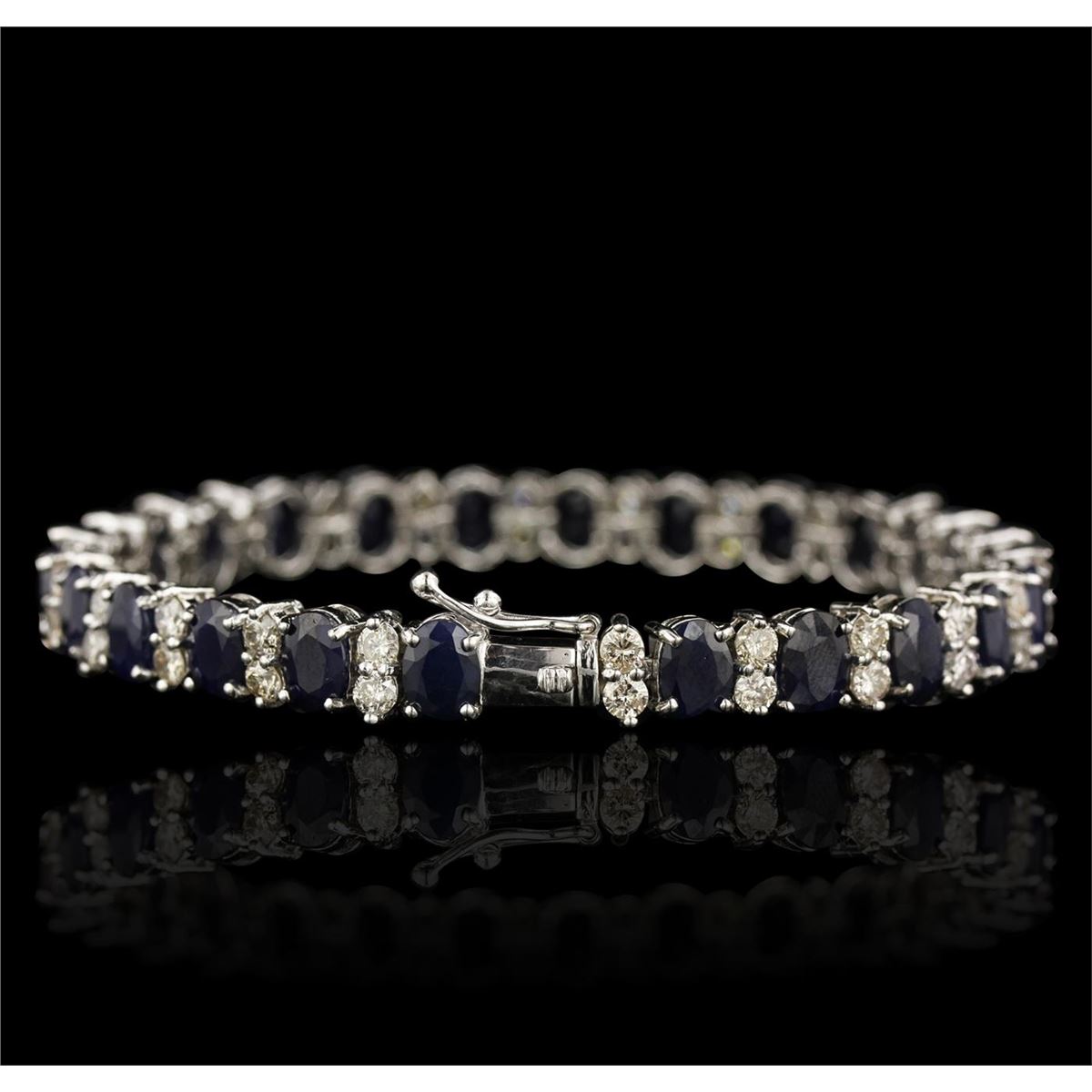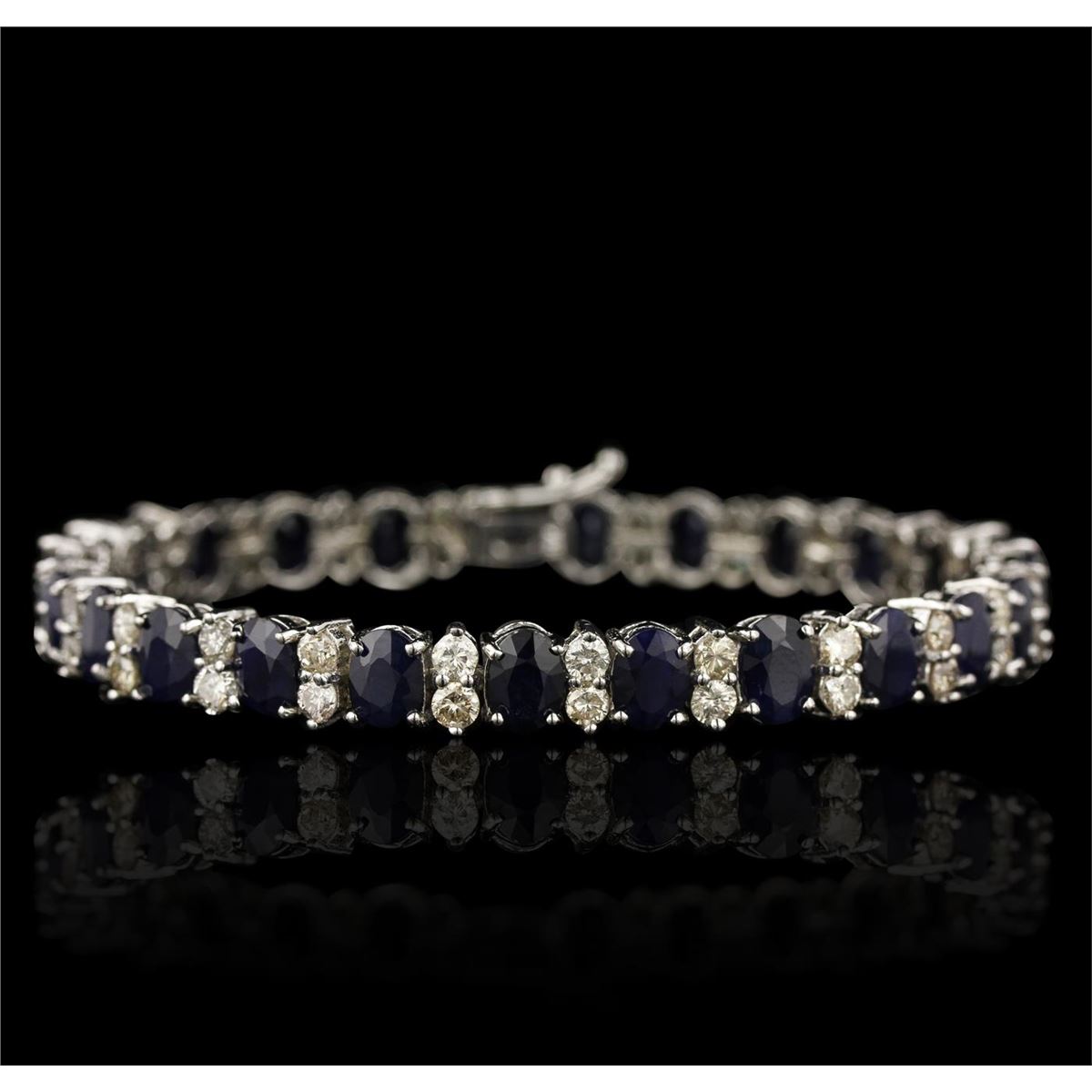 One electronically tested 14KT white gold Ladies combination cast & assembled bracelet with a hidden box clasp with a bright polish finish. Measurements: 7.5" in length. Condition is excellent. Containing: Twenty-four prong set oval modified brilliant cut natural blue sapphires, measuring 6.90 x 5.70 x 2.50mm, approximate total weight of 18.96ct., clarity is heavily included, type II, dark, moderately strong, blue color, (GIA B 7/4), cut is good. Colored gemstones are presumed to have been subjected to commonly used and possible undetectable color/clarity enhancement processes. Forty-Eight prong set round brilliant cut diamonds, measuring 2.90 - 2.90 x 1.74mm (depth est.) approximate total weight of 48 Stones = 4.28ct. Clarity of I-1 to I-2, Color of K - L, Cut is Good. Total Weight of Colored Stones 18.96ct. Total Weight of Diamonds 4.28ct. Total Weight of Bracelet 25.20gm. GGL Appraised at $18,875.00.