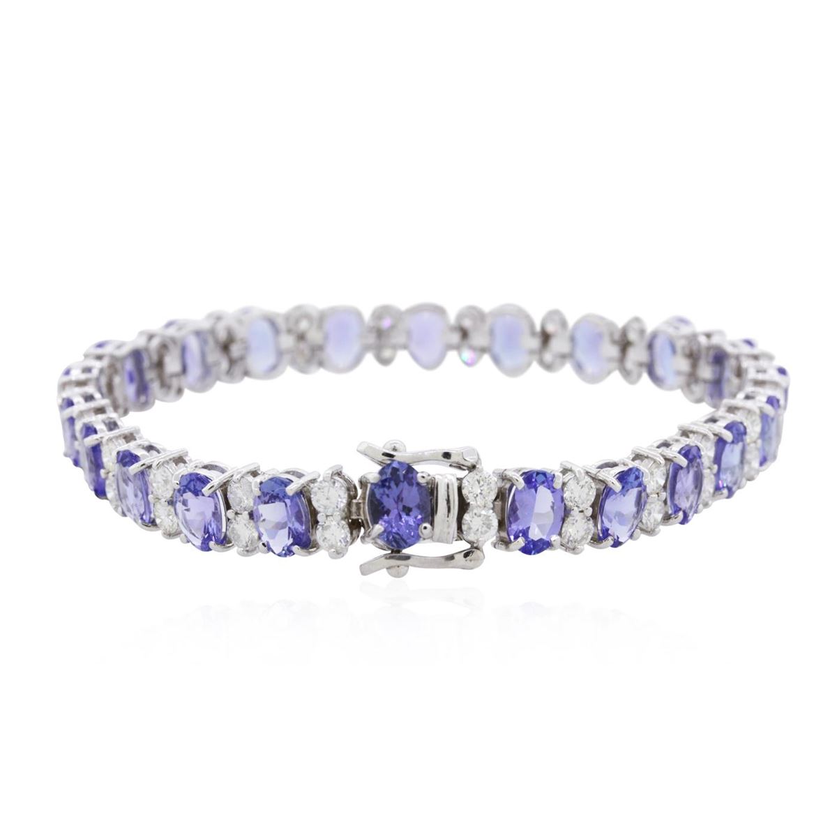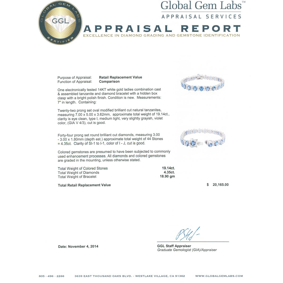 One electronically tested 14KT white gold ladies combination cast & assembled tanzanite and diamond bracelet with a hidden box clasp with a bright polish finish. Measurements: 7" in length. Condition is new. Containing: Twenty-two prong set oval modified brilliant cut natural tanzanites, measuring 7.00 x 5.00 x 3.62mm, approximate total weight of 19.14ct., clarity is eye clean, type I, medium light, very slightly grayish, violet color, (GIA V 4/3), cut is good. Forty-Four prong set round brilliant cut diamonds, measuring 3.00 - 3.00 x 1.80mm (depth est.) approximate total weight of 44 Stones = 4.35ct. Clarity: SI-1 to I-1. Color: I - J, Cut is Good. Colored gemstones are presumed to have been subjected to commonly used enhancement processes. All diamonds and colored gemstones are graded in the mounting, unless otherwise stated. Total Weight of Colored Stones 19.14ct. Total Weight of Diamonds 4.35ct. Total Weight of Bracelet 18.90 grams. GGL Appraised at $20,165.00.