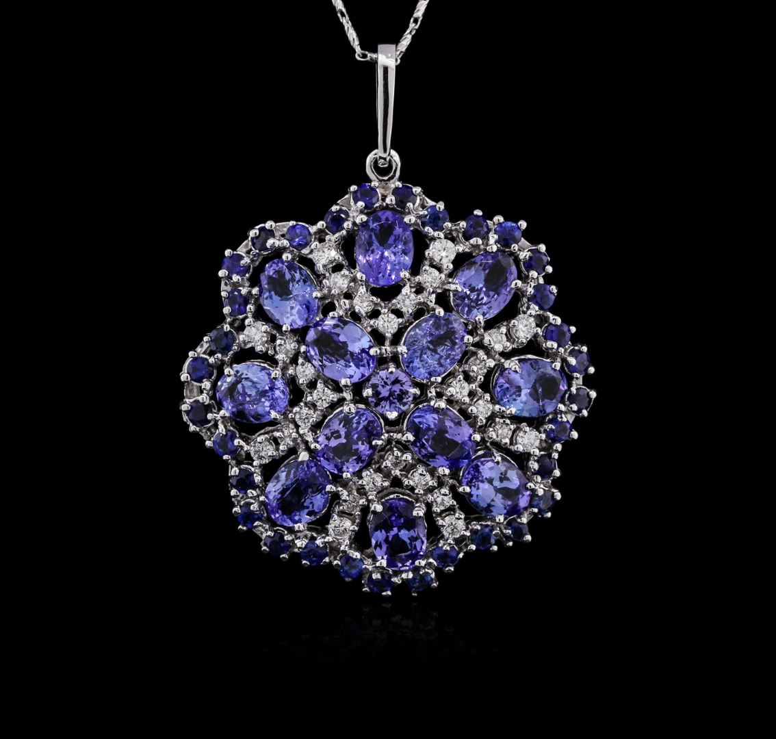 One electronically tested 14KT white gold ladies cast tanzanite, sapphire and diamond pendant & chain 18.0" long, with a lobster claw clasp with a bright polish finish. Identified with markings of "14KT". Condition is new. Containing: Twelve prong set oval modified brilliant cut natural tanzanites, measuring 8.00 x 6.00 x 3.90mm, approximate total weight of 15.24ct., clarity is eye clean, type I, medium light, very slightly grayish, violet color, (GIA V 4/3), cut is good. Thirty-two prong set round modified brilliant cut natural blue sapphires, measuring 2.50 - 2.50 x 1.63 mm, approximate total weight of 3.55ct., clarity is slightly included, type II, medium, moderately strong, blue color, (GIA B 5/4), cut is good. One prong set round modified brilliant cut natural tanzanite, measuring 5.00 - 5.00 x 3.25 mm, approximate weight of 0.40ct., clarity is eye clean, type I, medium light, very slightly grayish, violet color, (GIA V 4/3), cut is good. Twenty-Eight prong set round brilliant cut diamonds, measuring 2.00 - 2.00 x 1.20mm (depth est.) approximate total weight of 28 Stones = 1.22ct. Clarity: SI-1 to I-1. Color: I - J, Cut is Good. Colored gemstones are presumed to have been subjected to commonly used enhancement processes. All diamonds and colored gemstones are graded in the mounting, unless otherwise stated. Total Weight of Colored Stones 19.19ct. Total Weight of Diamonds 1.22ct. Total Weight of Pendant & Chain 26.00 grams. GGL Appraised at $12,905.00.
