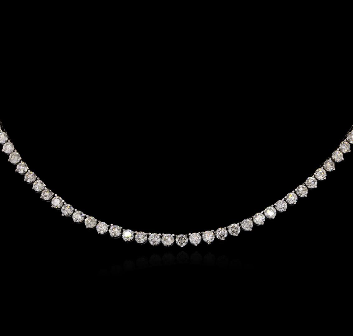 One electronically tested 14KT white gold ladies combination cast & assembled diamond necklace with a hidden box clasp with safety closer with a bright polish finish. Identified with markings of "14K". Condition is new. Containing: One Hundred Nine prong set round brilliant cut diamonds, measuring 3.70 - 3.50 x 2.16mm (depth est.) exact total weight 109 Stones = 19.68ct. Clarity: SI-2 to I-1. Color: H - J, Cut is Good. All diamonds are graded in the mounting, unless otherwise stated. Total Weight of Diamonds 19.68ct. Total Weight of Necklace 20.10 grams. GGL Appraised at $42,060.00.
