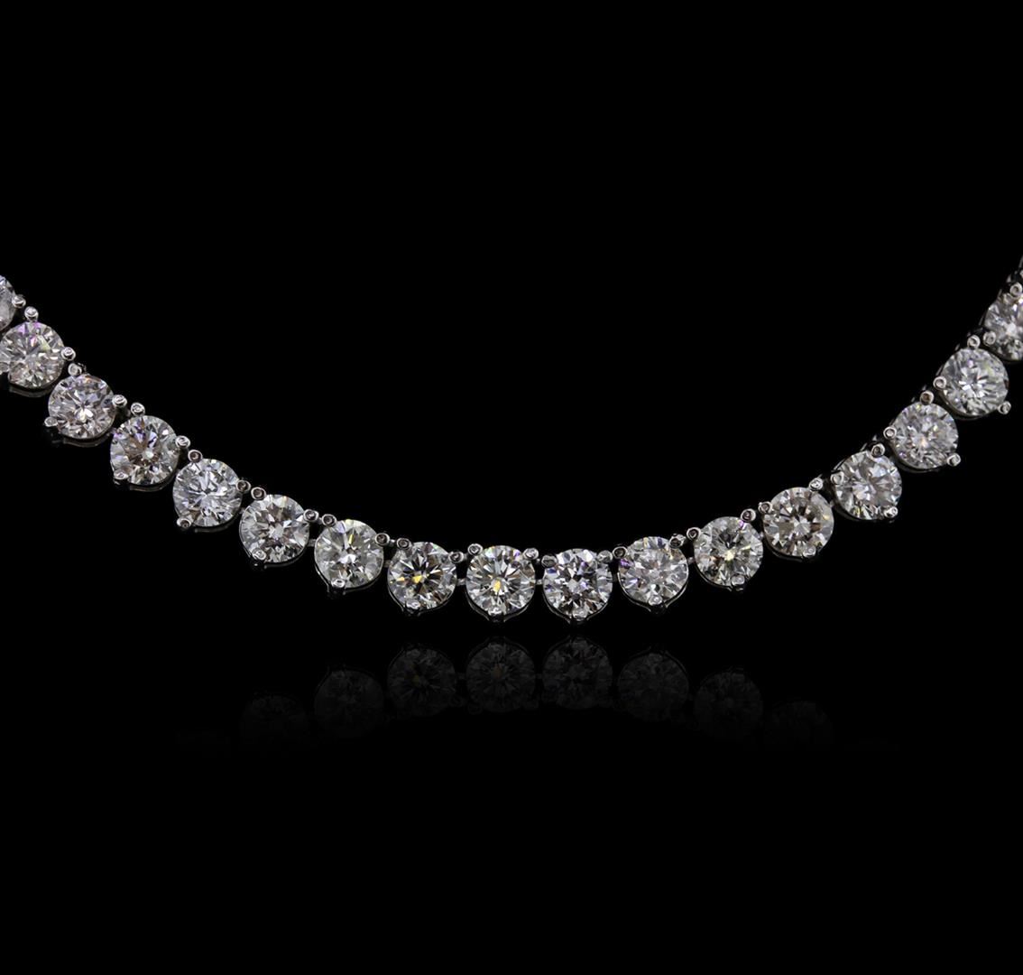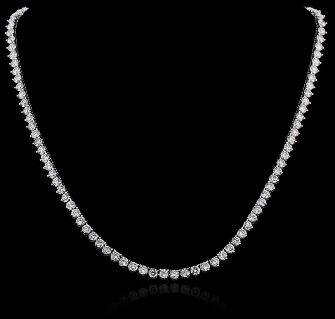 One electronically tested 14KT white gold ladies combination cast & assembled diamond necklace with a hidden box clasp with safety closer with a bright polish finish. Identified with markings of "14K". Condition is new. Containing: One Hundred Nine prong set round brilliant cut diamonds, measuring 3.70 - 3.50 x 2.16mm (depth est.) exact total weight 109 Stones = 19.68ct. Clarity: SI-2 to I-1. Color: H - J, Cut is Good. All diamonds are graded in the mounting, unless otherwise stated. Total Weight of Diamonds 19.68ct. Total Weight of Necklace 20.10 grams. GGL Appraised at $42,060.00.
