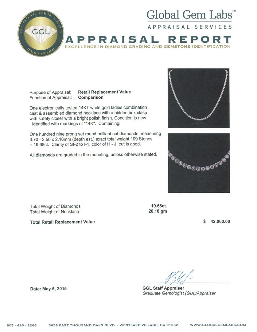 One electronically tested 14KT white gold ladies combination cast & assembled diamond necklace with a hidden box clasp with safety closer with a bright polish finish. Identified with markings of "14K". Condition is new. Containing: One Hundred Nine prong set round brilliant cut diamonds, measuring 3.70 - 3.50 x 2.16mm (depth est.) exact total weight 109 Stones = 19.68ct. Clarity: SI-2 to I-1. Color: H - J, Cut is Good. All diamonds are graded in the mounting, unless otherwise stated. Total Weight of Diamonds 19.68ct. Total Weight of Necklace 20.10 grams. GGL Appraised at $42,060.00.