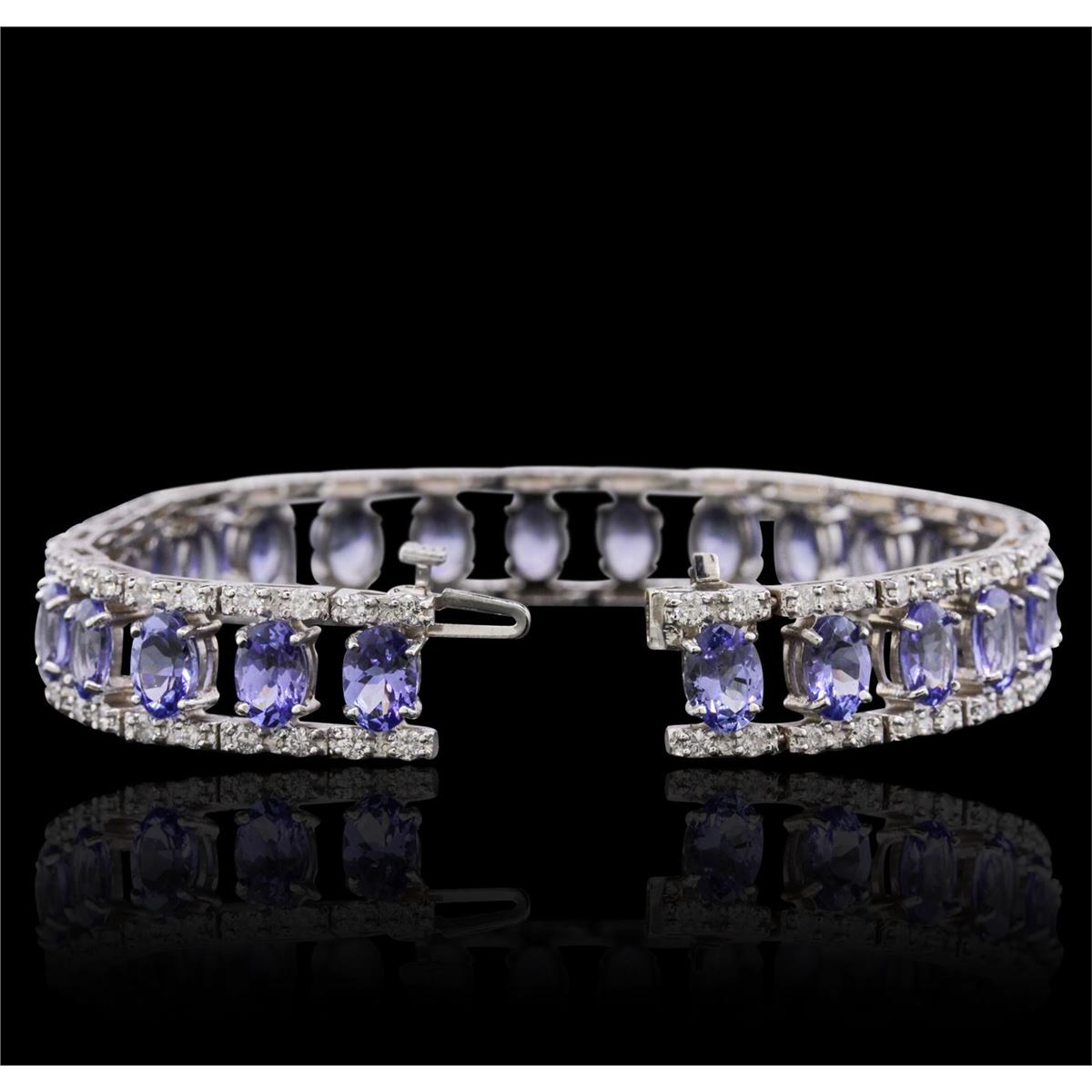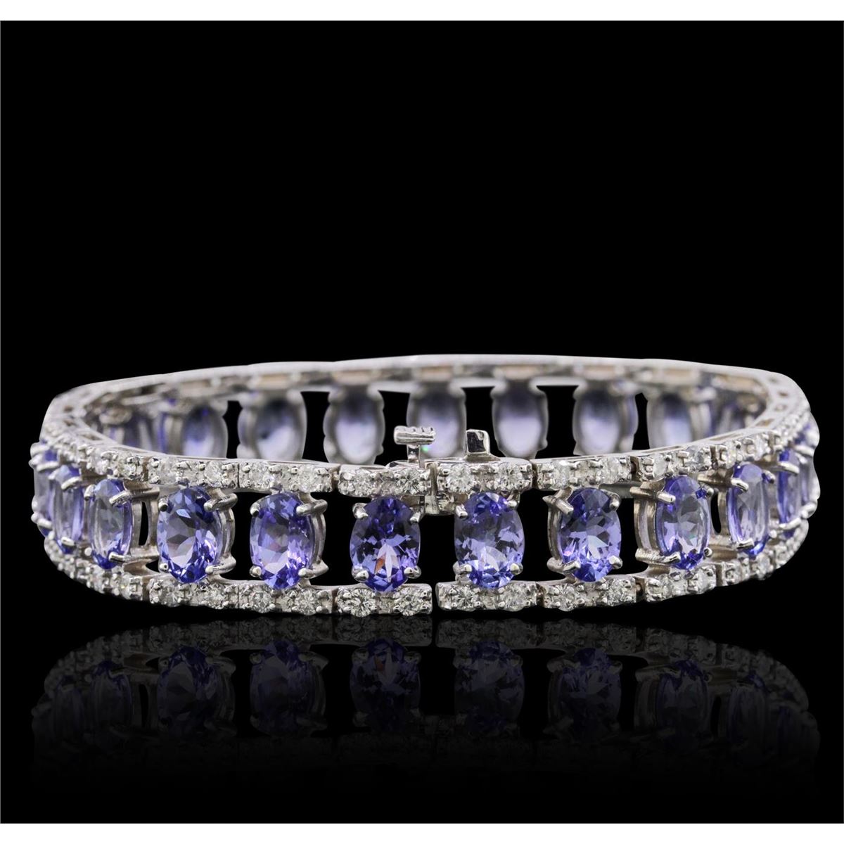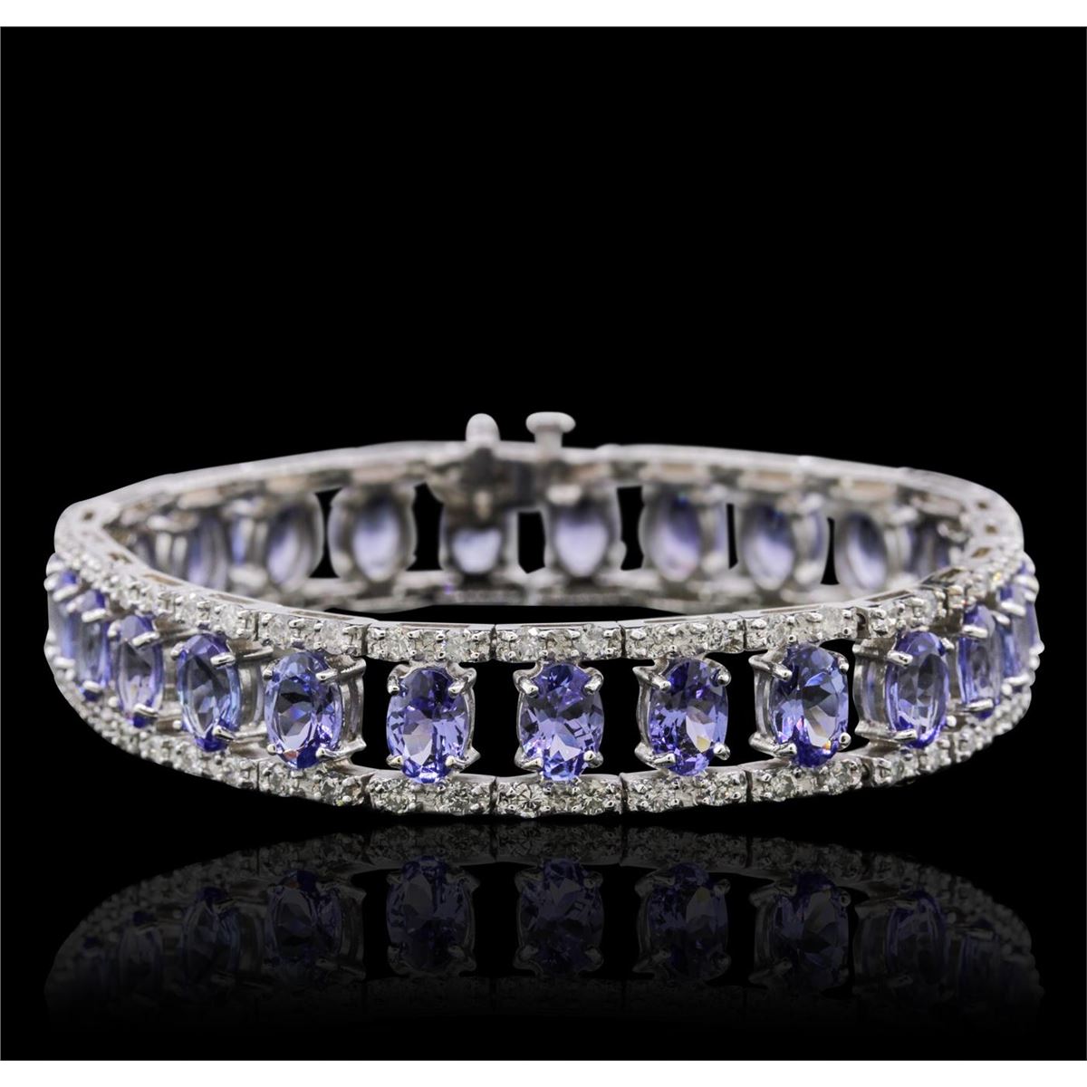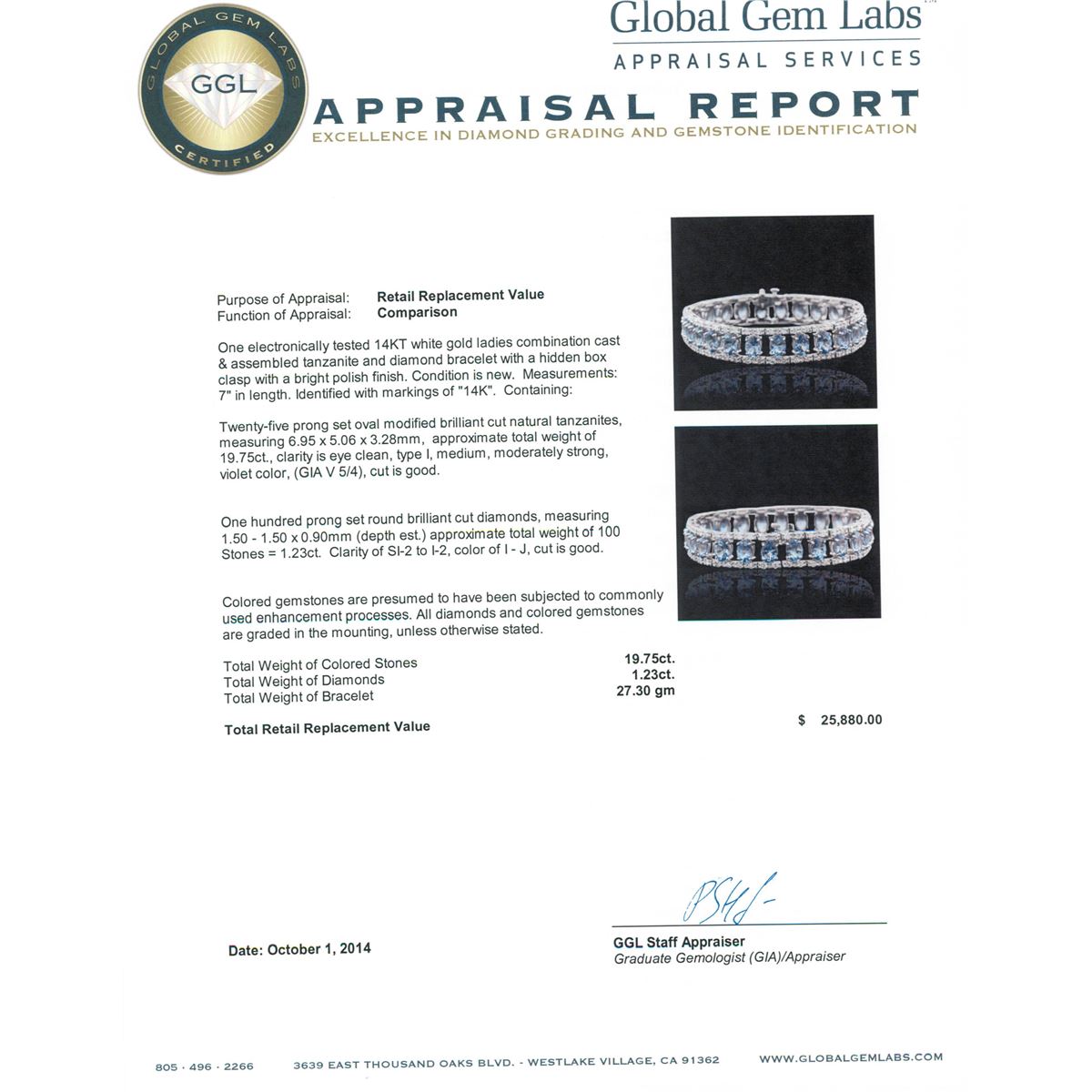 One electronically tested 14KT white gold ladies combination cast & assembled tanzanite and diamond bracelet with a hidden box clasp with a bright polish finish. Measurements: 7" in length. Identified with markings of "14K". Condition is new. Containing: Twenty-five prong set oval modified brilliant cut natural tanzanites, measuring 6.95 x 5.06 x 3.28mm, approximate total weight of 19.75ct., clarity is eye clean, type I, medium, moderately strong, violet color, (GIA V 5/4), cut is good. One Hundred prong set round brilliant cut diamonds, measuring 1.50 - 1.50 x 0.90mm (depth est.) approximate total weight of 100 Stones = 1.23ct. Clarity: SI-2 to I-2. Color: I - J, Cut is Good. Colored gemstones are presumed to have been subjected to commonly used enhancement processes. All diamonds and colored gemstones are graded in the mounting, unless otherwise stated. Total Weight of Colored Stones 19.75ct. Total Weight of Diamonds 1.23ct. Total Weight of Bracelet 27.30 grams. GGL Appraised at $25,880.00.
