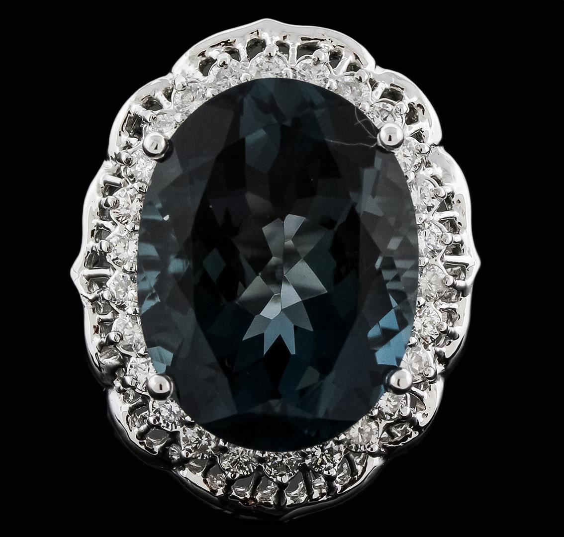 One electronically tested 14KT white gold ladies cast topaz and diamond ring with a bright polish finish. Identified with markings of "K14". Condition is new. Containing: One prong set oval modified brilliant cut natural blue topaz, measuring 19.60 x 14.50 x 9.43mm, approximate weight of 19.87ct., clarity is eye clean, type I, medium, moderately strong, very slightly greenish blue color, (GIA vslgB 5/4), cut is good. Twenty-Six prong set round brilliant cut diamonds, measuring 2.00 - 2.00 x 1.20mm (depth est.) approximate. total weight of 26 Stones = 0.76ct. Clarity: SI-1 to I-1. Color: I - J, Cut is Good. Colored gemstones are presumed to have been subjected to commonly used enhancement processes. All diamonds and colored gemstones are graded in the mounting, unless otherwise stated. Total Weight of Colored Stones 19.87ct. Total Weight of Diamonds 0.76ct. Total Weight of Ring 12.00 grams. GGL Appraised at $4,640.00.