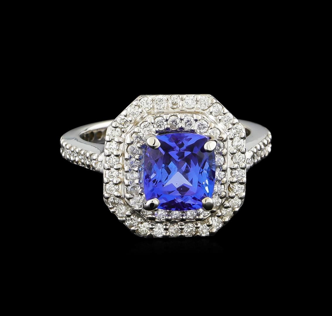One electronically tested 14KT white gold ladies combination cast & assembled tanzanite and diamond ring with a flat shank with a bright polish finish. Identified with markings of "14K". Condition is new. Containing: One prong set square cushion modified brilliant cut natural tanzanite, measuring 7.72 x 6.90 x 4.75mm, approximate weight of 2.00ct., clarity is eye clean, type I, medium light, very slightly grayish, violet color, (GIA V 4/3), cut is good. Eighty-Five prong set round brilliant cut diamonds, measuring 1.30 - 1.30 x 0.78mm (depth est.) approximate total weight of 85 Stones = 0.68ct. Clarity: I-1 to I-2. Color: I - J, Cut is Good. Colored gemstones are presumed to have been subjected to commonly used enhancement processes. All diamonds and colored gemstones are graded in the mounting, unless otherwise stated. Total Weight of Colored Stones 2.00ct. Total Weight of Diamonds 0.68ct. Total Weight of Ring 5.20 grams. GGL Appraised at $5,690.00.