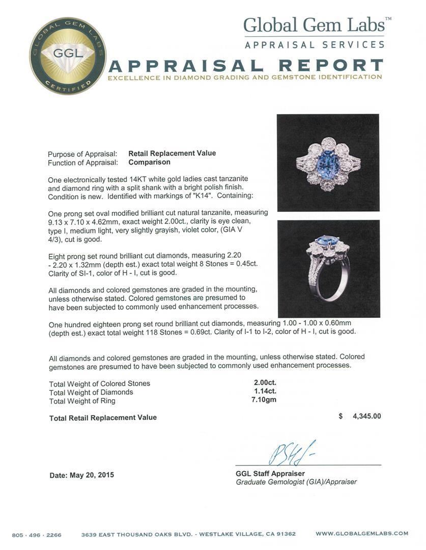 One electronically tested 14KT white gold ladies cast tanzanite and diamond ring with a split shank with a bright polish finish. Identified with markings of "K14". Condition is new. Containing: One prong set oval modified brilliant cut natural tanzanite, measuring 9.13 x 7.10 x 4.62mm, exact weight 2.00 ct., clarity is eye clean, type I, medium light, very slightly grayish, violet color, (GIA V 4/3), cut is good. Eight prong set round brilliant cut diamonds, measuring 2.20 - 2.20 x 1.32mm (depth est.) exact total weight 8 Stones = 0.45ct. Clarity: SI-1. Color: H - I, Cut is Good. All diamonds and colored gemstones are graded in the mounting, unless otherwise stated. Colored gemstones are presumed to have been subjected to commonly used enhancement processes. One Hundred Eighteen prong set round brilliant cut diamonds, measuring 1.00 - 1.00 x 0.60mm (depth est.) exact total weight 118 Stones = 0.69ct. Clarity: I-1 to I-2. Color: H - I, Cut is Good. All diamonds and colored gemstones are graded in the mounting, unless otherwise stated. Colored gemstones are presumed to have been subjected to commonly used enhancement processes. Total Weight of Colored Stones 2.00 ct. Total Weight of Diamonds 1.14ct. Total Weight of Ring 7.10 grams. GGL Appraised.