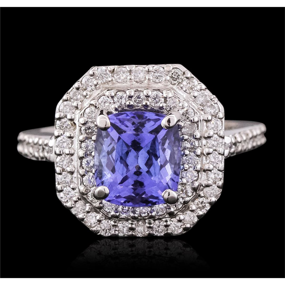 One electronically tested 14KT white gold ladies combination cast & assembled tanzanite and diamond ring with a flat shank with a bright polish finish. Identified with markings of "14K". Condition is new. Containing: One prong set square cushion modified brilliant cut natural tanzanite, measuring 7.72 x 6.90 x 4.75mm, approximate weight of 2.00ct., clarity is eye clean, type I, medium light, very slightly grayish, violet color, (GIA V 4/3), cut is good. Eighty-Five prong set round brilliant cut diamonds, measuring 1.30 - 1.30 x 0.78mm (depth est.) approximate total weight of 85 Stones = 0.68ct. Clarity: I-1 to I-2. Color: I - J, Cut is Good. Colored gemstones are presumed to have been subjected to commonly used enhancement processes. All diamonds and colored gemstones are graded in the mounting, unless otherwise stated. Total Weight of Colored Stones 2.00ct. Total Weight of Diamonds 0.68ct. Total Weight of Ring 5.20 grams. GGL Appraised at $5,690.00.