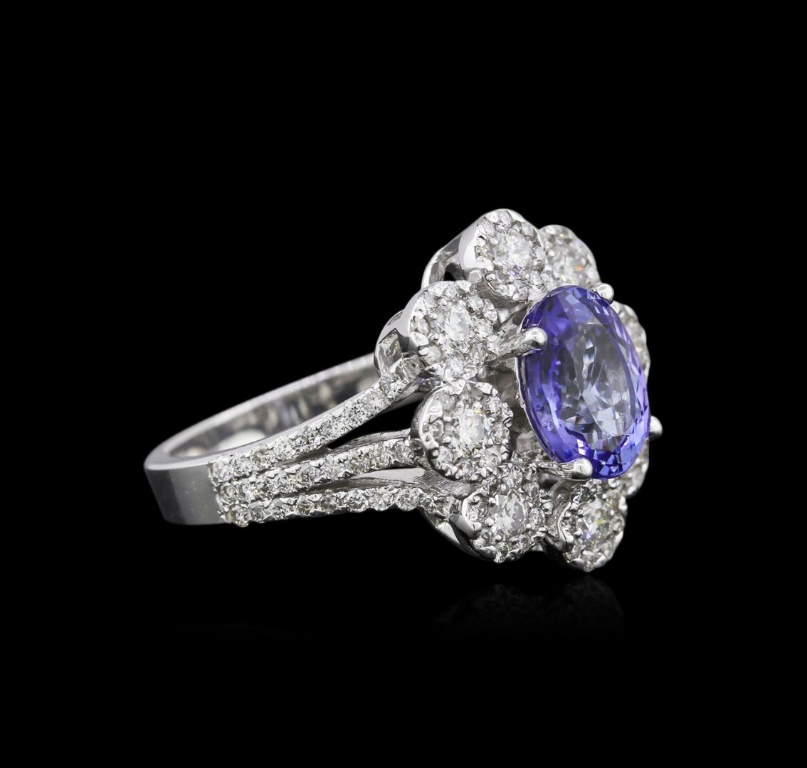One electronically tested 14KT white gold ladies cast tanzanite and diamond ring with a split shank with a bright polish finish. Identified with markings of "K14". Condition is new. Containing: One prong set oval modified brilliant cut natural tanzanite, measuring 9.13 x 7.10 x 4.62mm, exact weight 2.00ct., clarity is eye clean, type I, medium light, very slightly grayish, violet color, (GIA V 4/3), cut is good. Eight prong set round brilliant cut diamonds, measuring 2.20 - 2.20 x 1.32mm (depth est.) exact total weight 8 Stones = 0.45ct. Clarity: SI-1. Color: H - I, Cut is Good. All diamonds and colored gemstones are graded in the mounting, unless otherwise stated. Colored gemstones are presumed to have been subjected to commonly used enhancement processes. One Hundred Eighteen prong set round brilliant cut diamonds, measuring 1.00 - 1.00 x 0.60mm (depth est.) exact total weight 118 Stones = 0.69ct. Clarity: I-1 to I-2. Color: H - I, Cut is Good. All diamonds and colored gemstones are graded in the mounting, unless otherwise stated. Colored gemstones are presumed to have been subjected to commonly used enhancement processes. Total Weight of Colored Stones 2.00ct. Total Weight of Diamonds 1.14ct. Total Weight of Ring 7.10 grams. GGL Appraised at $4,345.00.