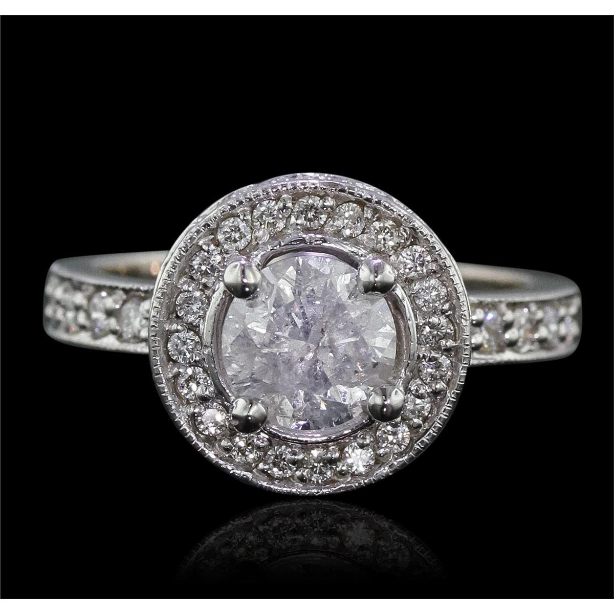 One electronically tested 14KT white gold Ladies combination cast & assembled engagement ring with a bright polish finish. Condition is very good. Identified with markings of "14K". Containing: One prong set round brilliant cut diamond, measuring 6.83 - 6.83 x 4.49mm (depth est.) approximate weight of 1.28ct. Clarity: I-3. Color: J, Cut is Good. Fifty-Three prong set round brilliant cut diamonds, measuring 1.70 - 1.40 x 0.93mm (depth est.) approximate. Total Weight of 53 Stones = 0.72ct. Clarity: SI-2 to I-2. Color: I - J, Cut is Good. Diamonds graded in the mounting. Total Weight of Diamonds 2.00ct. Total Weight of Ring 5.70 grams. GGL Appraised at $7,960.00.