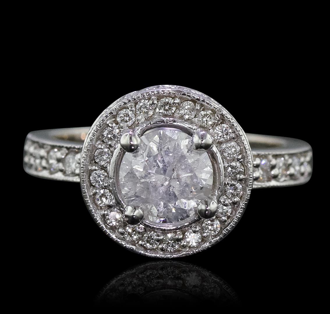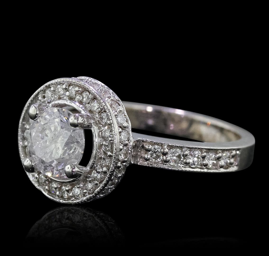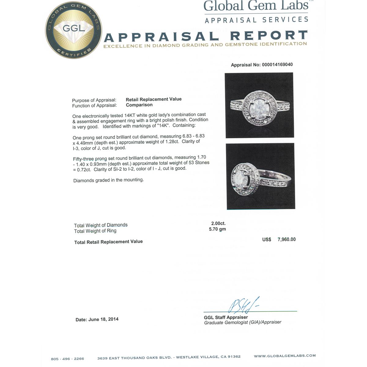 One electronically tested 14KT white gold Ladies combination cast & assembled engagement ring with a bright polish finish. Condition is very good. Identified with markings of "14K". Containing: One prong set round brilliant cut diamond, measuring 6.83 - 6.83 x 4.49mm (depth est.) approximate weight of 1.28ct. Clarity: I-3. Color: J, Cut is Good. Fifty-Three prong set round brilliant cut diamonds, measuring 1.70 - 1.40 x 0.93mm (depth est.) approximate. Total Weight of 53 Stones = 0.72ct. Clarity: SI-2 to I-2. Color: I - J, Cut is Good. Diamonds graded in the mounting. Total Weight of Diamonds 2.00ct. Total Weight of Ring 5.70 grams. GGL Appraised at $7,960.00.