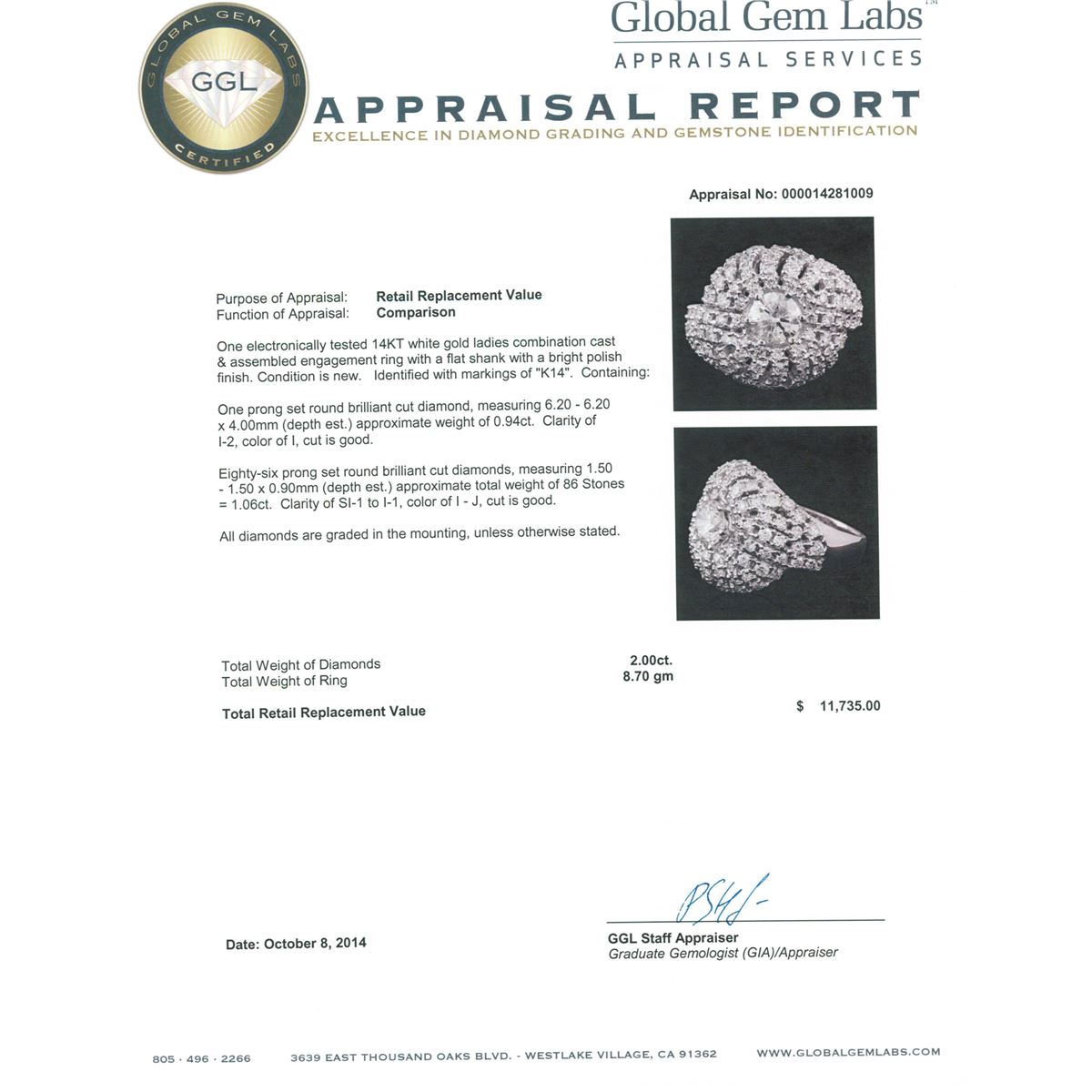One electronically tested 14KT white gold ladies combination cast & assembled engagement ring with a flat shank with a bright polish finish. Identified with markings of "K14". Condition is new. Containing: One prong set round brilliant cut diamond, measuring 6.20 - 6.20 x 4.00mm (depth est.) approximate weight of 0.94ct. Clarity: I-2. Color: I, Cut is Good. Eighty-Six prong set round brilliant cut diamonds, measuring 1.50 - 1.50 x 0.90mm (depth est.) approximate total weight of 86 Stones = 1.06ct. Clarity: SI-1 to I-1. Color: I - J, Cut is Good. All diamonds are graded in the mounting, unless otherwise stated. Total Weight of Diamonds 2.00ct. Total Weight of Ring 8.70 grams. GGL Appraised at $11,735.00.