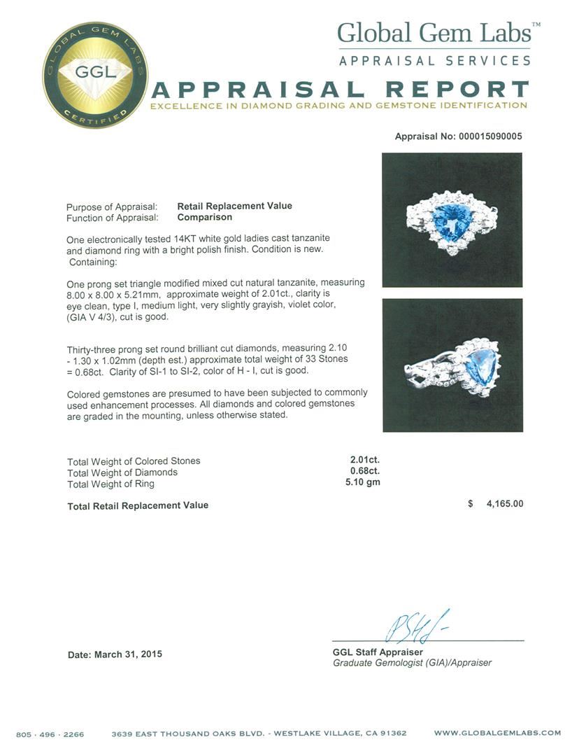 One electronically tested 14KT white gold ladies cast tanzanite and diamond ring with a bright polish finish. Condition is new. Containing: One prong set triangle modified mixed cut natural tanzanite, measuring 8.00 x 8.00 x 5.21mm, approximate weight of 2.01ct., clarity is eye clean, type I, medium light, very slightly grayish, violet color, (GIA V 4/3), cut is good. Thirty-Three prong set round brilliant cut diamonds, measuring 2.10 - 1.30 x 1.02mm (depth est.) approximate total weight of 33 Stones = 0.68ct. Clarity: SI-1 to SI-2. Color: H - I, Cut is Good. Colored gemstones are presumed to have been subjected to commonly used enhancement processes. All diamonds and colored gemstones are graded in the mounting, unless otherwise stated. Total Weight of Colored Stones 2.01ct. Total Weight of Diamonds 0.68ct. Total Weight of Ring 5.10 grams. GGL Appraised at $4,165.00.