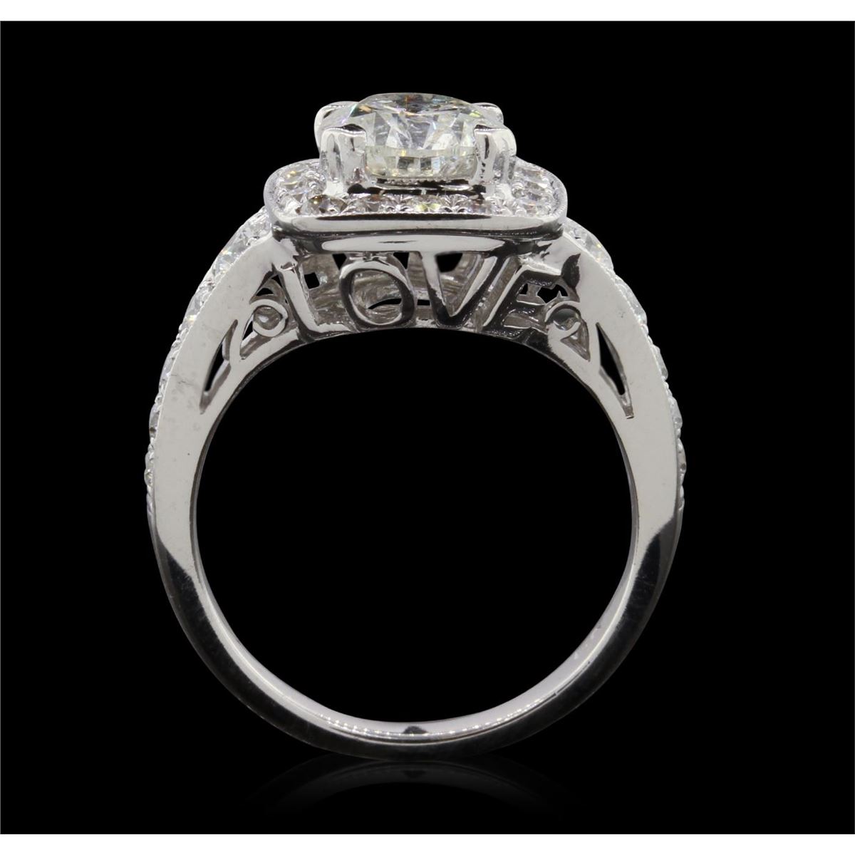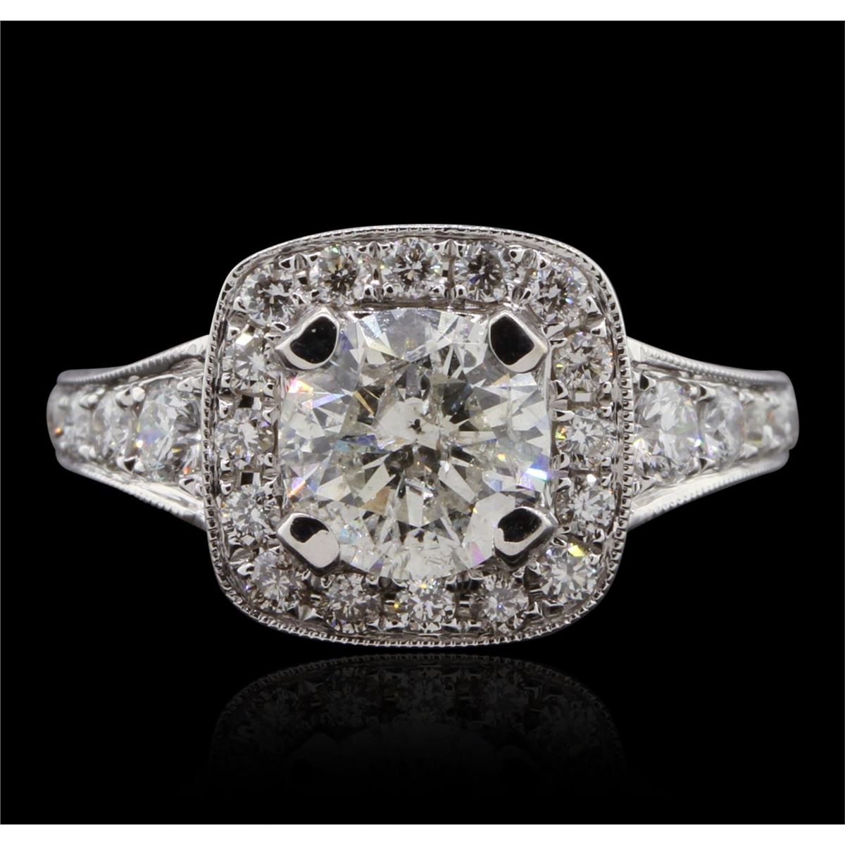 One electronically tested 14KT white gold Ladies combination cast & assembled engagement ring with a bright polish finish. Identified with markings of "14K". Condition is excellent. Containing: One prong set round brilliant cut diamond, measuring 6.80 - 6.80 x 4.20mm (depth est.) approximate weight of 1.21ct. Clarity of I-2, Color of K, Cut is Good. Twenty-Six prong set round brilliant cut diamonds, measuring 2.60 - 1.50 x 1.23mm (depth est.) approximate total weight of 26 Stones = 0.80ct. Clarity of VS-1 to VS-2, Color of G - H, Cut is Very Good. Total Weight of Diamonds 2.01ct. Total Weight of Ring 4.90gm. GGL Appraised at $16,010.00.