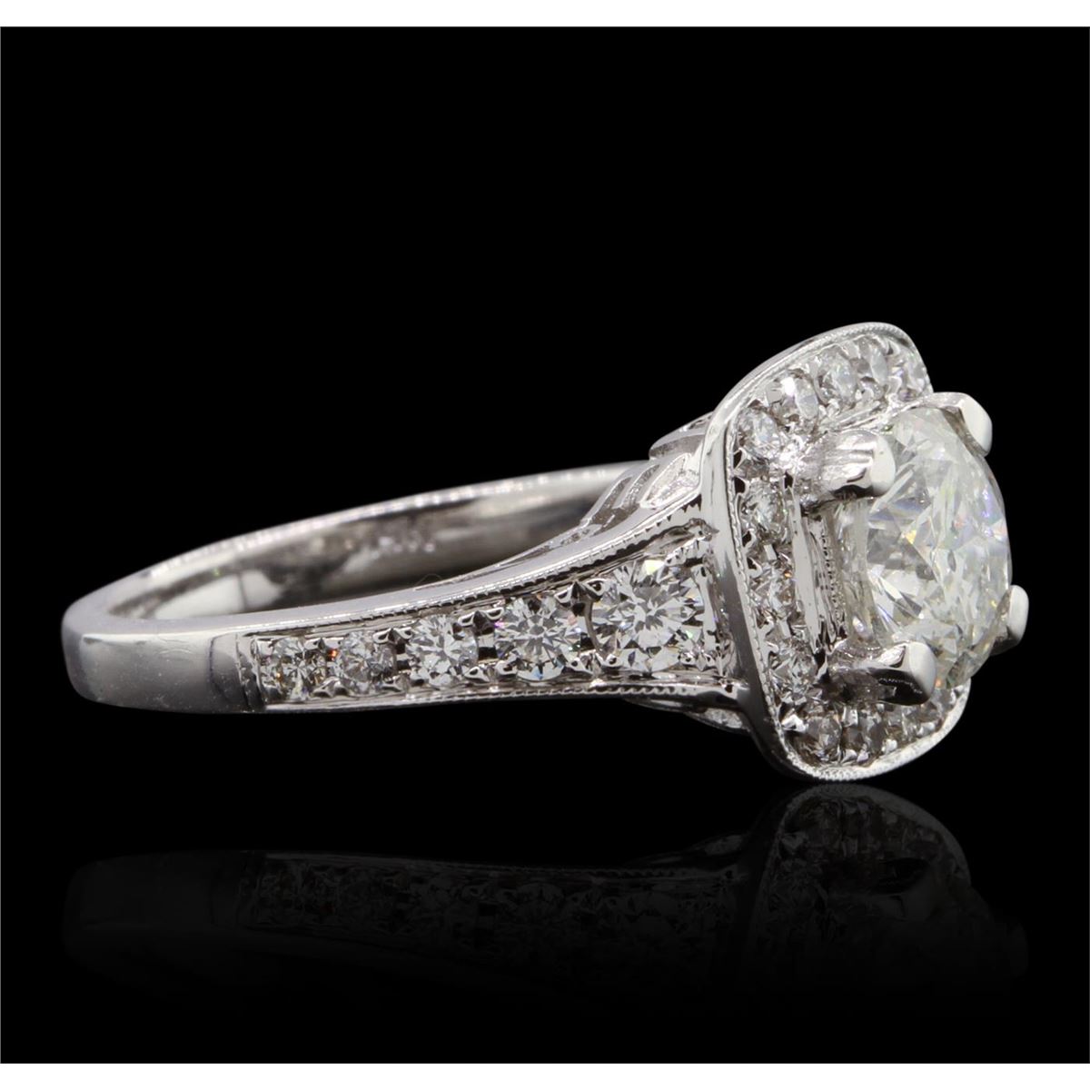 One electronically tested 14KT white gold Ladies combination cast & assembled engagement ring with a bright polish finish. Identified with markings of "14K". Condition is excellent. Containing: One prong set round brilliant cut diamond, measuring 6.80 - 6.80 x 4.20mm (depth est.) approximate weight of 1.21ct. Clarity of I-2, Color of K, Cut is Good. Twenty-Six prong set round brilliant cut diamonds, measuring 2.60 - 1.50 x 1.23mm (depth est.) approximate total weight of 26 Stones = 0.80ct. Clarity of VS-1 to VS-2, Color of G - H, Cut is Very Good. Total Weight of Diamonds 2.01ct. Total Weight of Ring 4.90gm. GGL Appraised at $16,010.00.
