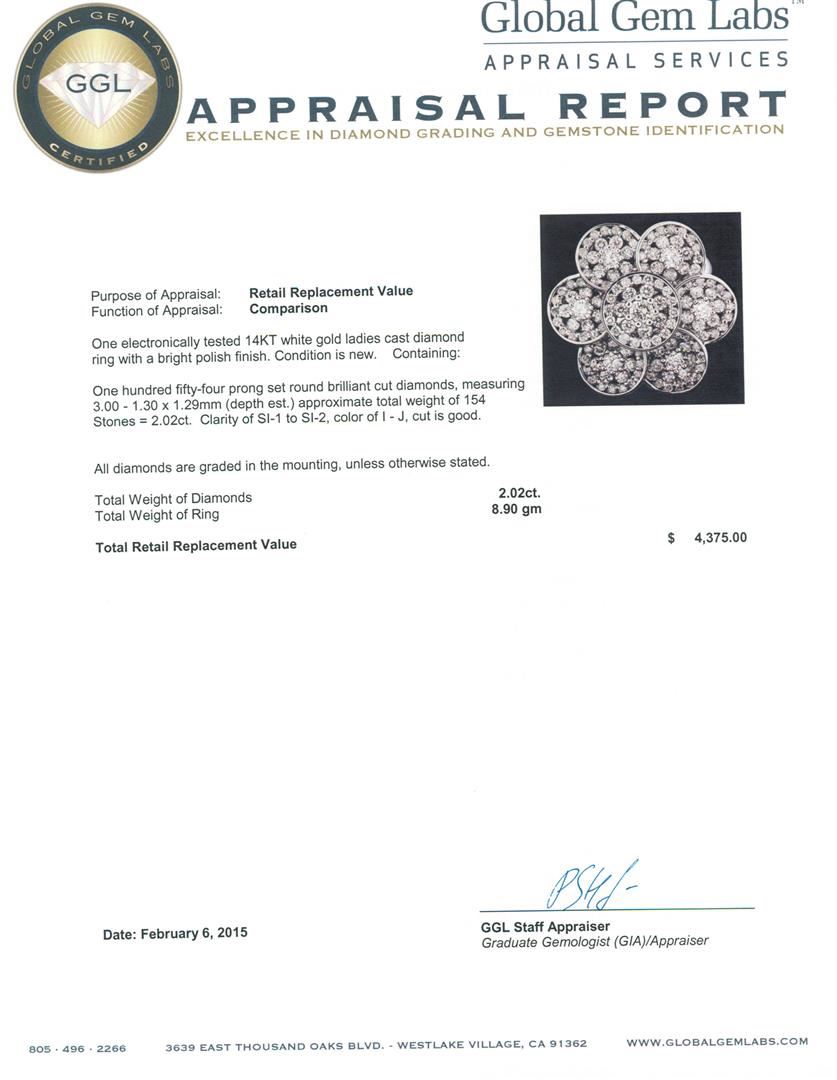 One electronically tested 14KT white gold ladies cast diamond ring with a bright polish finish. Condition is new. Containing: One Hundred Fifty-Four prong set round brilliant cut diamonds, measuring 3.00 - 1.30 x 1.29mm (depth est.) approximate. Total Weight of 154 Stones = 2.02ct. Clarity: SI-1 to SI-2. Color: I - J, Cut is Good. All diamonds are graded in the mounting, unless otherwise stated. Total Weight of Diamonds 2.02ct. Total Weight of Ring 8.90 grams. GGL Appraised at $4,375.00.