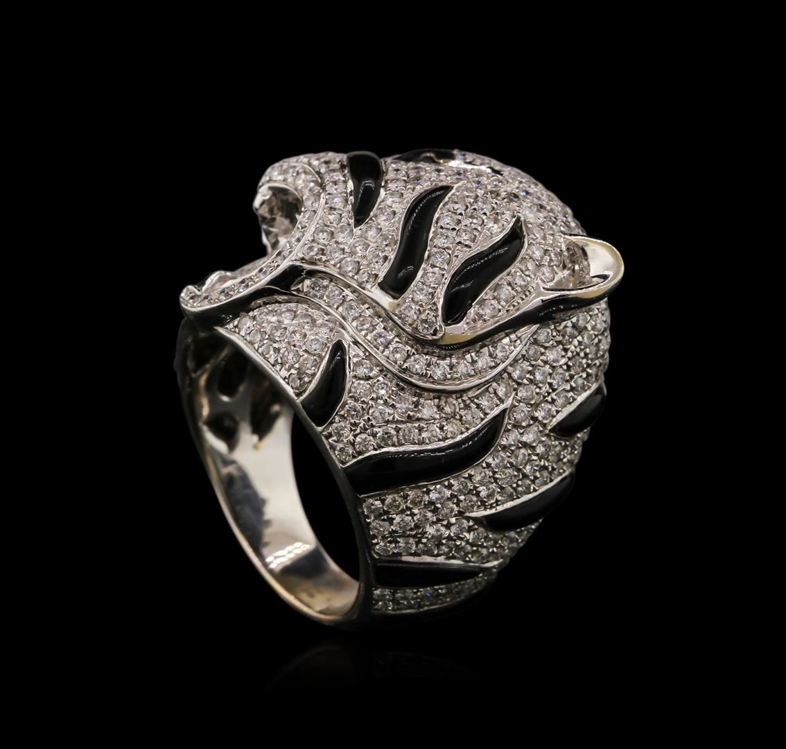 One electronically tested 14KT white gold ladies cast onyx and diamond ring with a bright polish finish. Identified with markings of "14K". Condition is new. Containing: Fourteen bezel set fantasy cut cut natural black onyxs, measuring 10.00. x 2.50 x 1.63mm, approximate total weight of 2.02ct., clarity is severely included, black, vivid, black color, (GIA Bl 10/6), cut is good. Three Hundred Eighty-One prong set round brilliant cut diamonds, measuring 1.20 - 1.20 x 0.72mm (depth est.) approximate total weight of 381 Stones = 2.51ct. Clarity: I-1 to I-2. Color: G - H, Cut is Good. Colored gemstones are presumed to have been subjected to commonly used enhancement processes. All diamonds and colored gemstones are graded in the mounting, unless otherwise stated. Total Weight of Colored Stones 2.02ct. Total Weight of Diamonds 2.51ct. Total Weight of Ring 14.70 grams. GGL Appraised at $6,490.00.