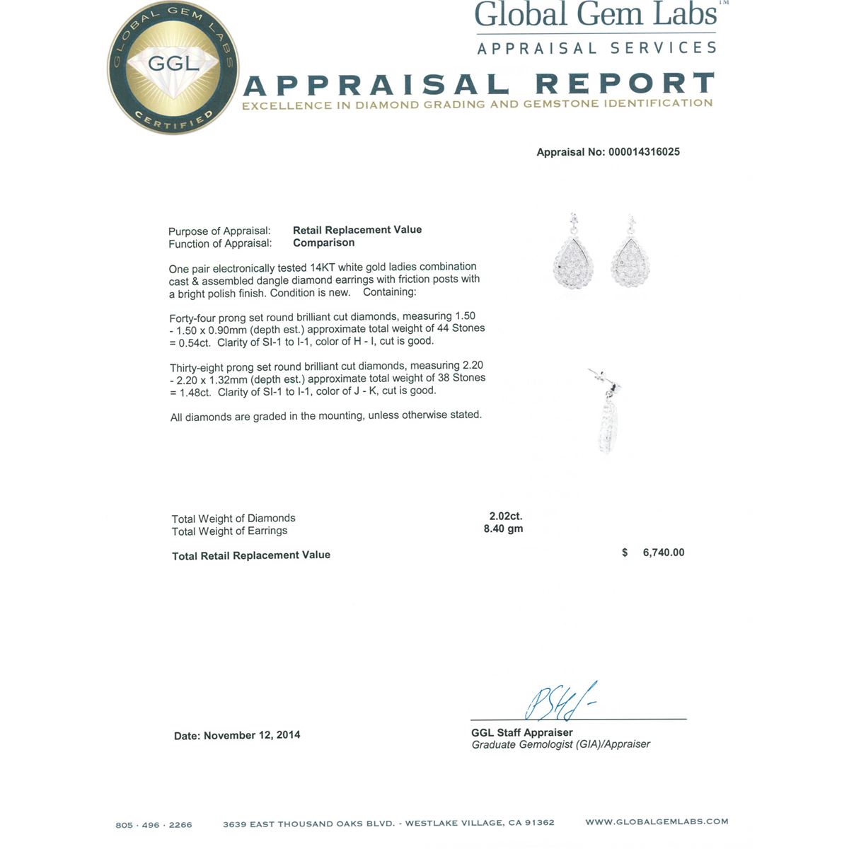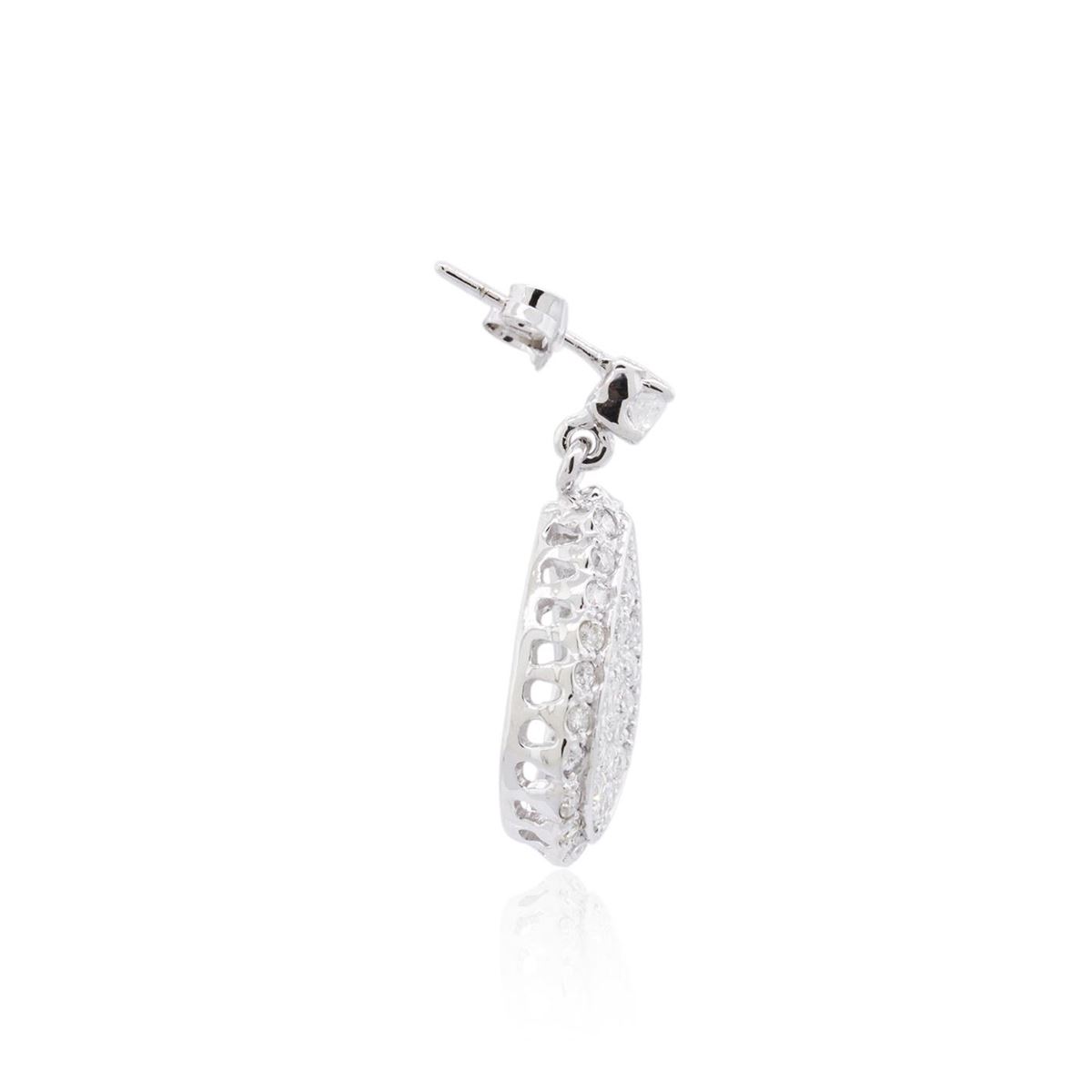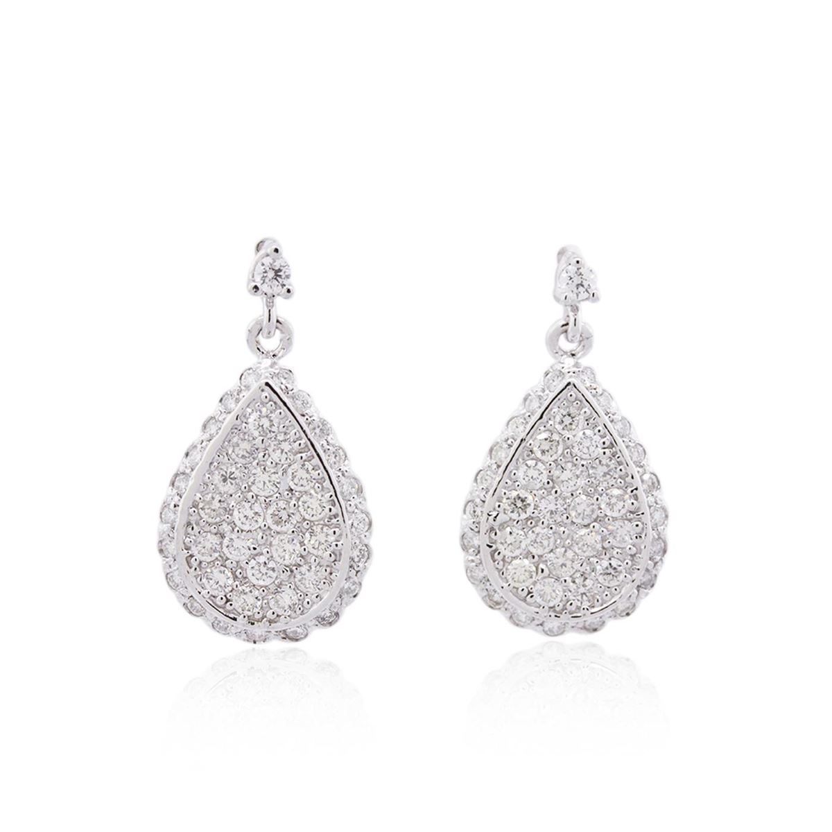 One pair electronically tested 14KT white gold ladies combination cast & assembled dangle diamond earrings with friction posts with a bright polish finish. Condition is new. Containing: Forty-Four prong set round brilliant cut diamonds, measuring 1.50 - 1.50 x 0.90mm (depth est.) approximate total weight of 44 Stones = 0.54ct. Clarity: SI-1 to I-1. Color: H - I, Cut is Good. Thirty-Eight prong set round brilliant cut diamonds, measuring 2.20 - 2.20 x 1.32mm (depth est.) approximate total weight of 38 Stones = 1.48ct. Clarity: SI-1 to I-1. Color: J - K, Cut is Good. All diamonds are graded in the mounting, unless otherwise stated. Total Weight of Diamonds 2.02ct. Total Weight of Earrings 8.40 grams. GGL Appraised at $6,740.00.