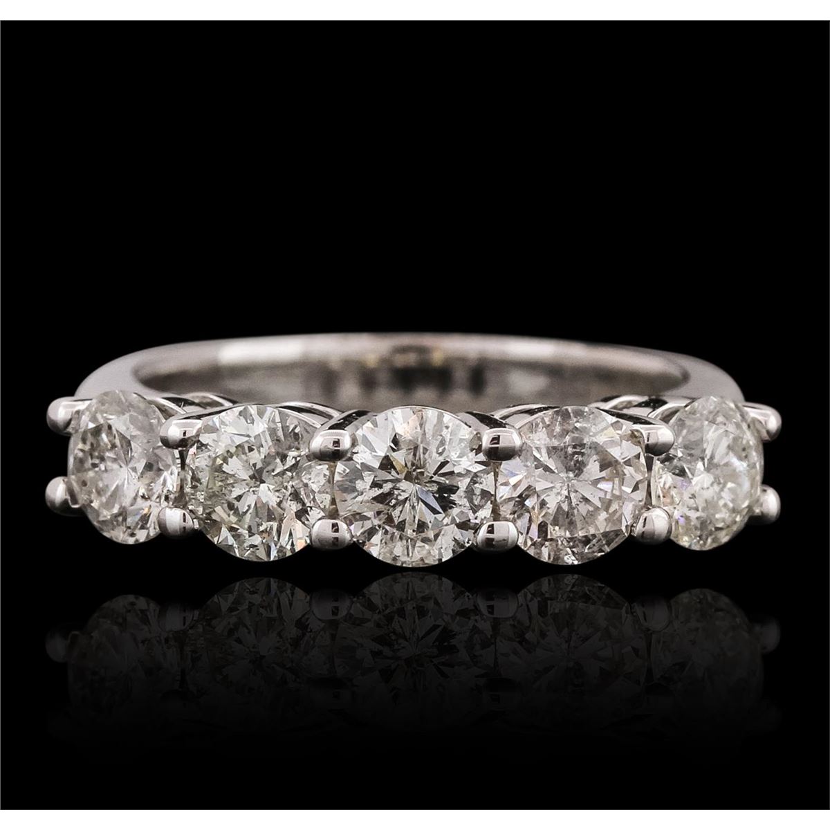 One electronically tested 14KT white gold ladies cast anniversary ring with a bright polish finish. Identified with markings of "14K". Condition is new. Containing: Five prong set round brilliant cut diamonds, measuring 4.80 - 4.80 x 2.88mm (depth est.) approximate total weight of 5 Stones = 2.02ct. Clarity: I-1 to I-2. Color: J, Cut is Good. All diamonds are graded in the mounting, unless otherwise stated. Total Weight of Diamonds 2.02ct. Total Weight of Ring 5.40 grams. GGL Appraised at $8,355.00.