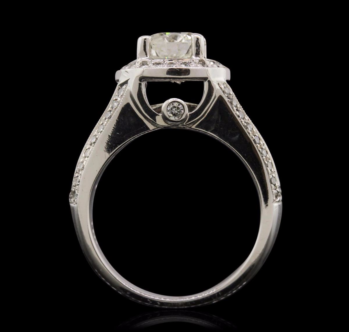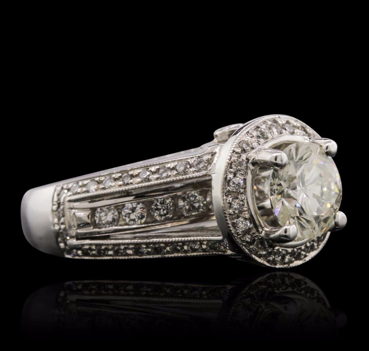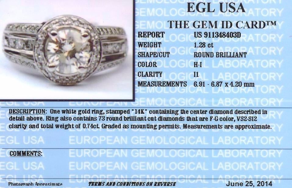 One electronically tested 14KT white gold Ladies combination cast & assembled engagement ring with a bright polish finish. Condition is new. Identified with markings of "14K". Containing: One prong set round brilliant cut diamond, measuring 6.91 - 6.87 x 4.20mm (depth est.) approximate weight of 1.28ct. Clarity: I-1. Color: H, Cut is Good. Seventy-Three prong set round brilliant cut diamonds, measuring 1.40 - 1.40 x 0.84mm (depth est.) approximate. Total Weight of 73 Stones = 0.74ct. Clarity: VS-2 to SI-2. Color: F - G, Cut is Good. EGL USA GEM ID# US 911348403D. All diamonds are graded in the mounting, unless otherwise stated. Total Weight of Diamonds 2.02ct. Total Weight of Engagement Ring 9.80 grams. GGL Appraised at $25,465.00.