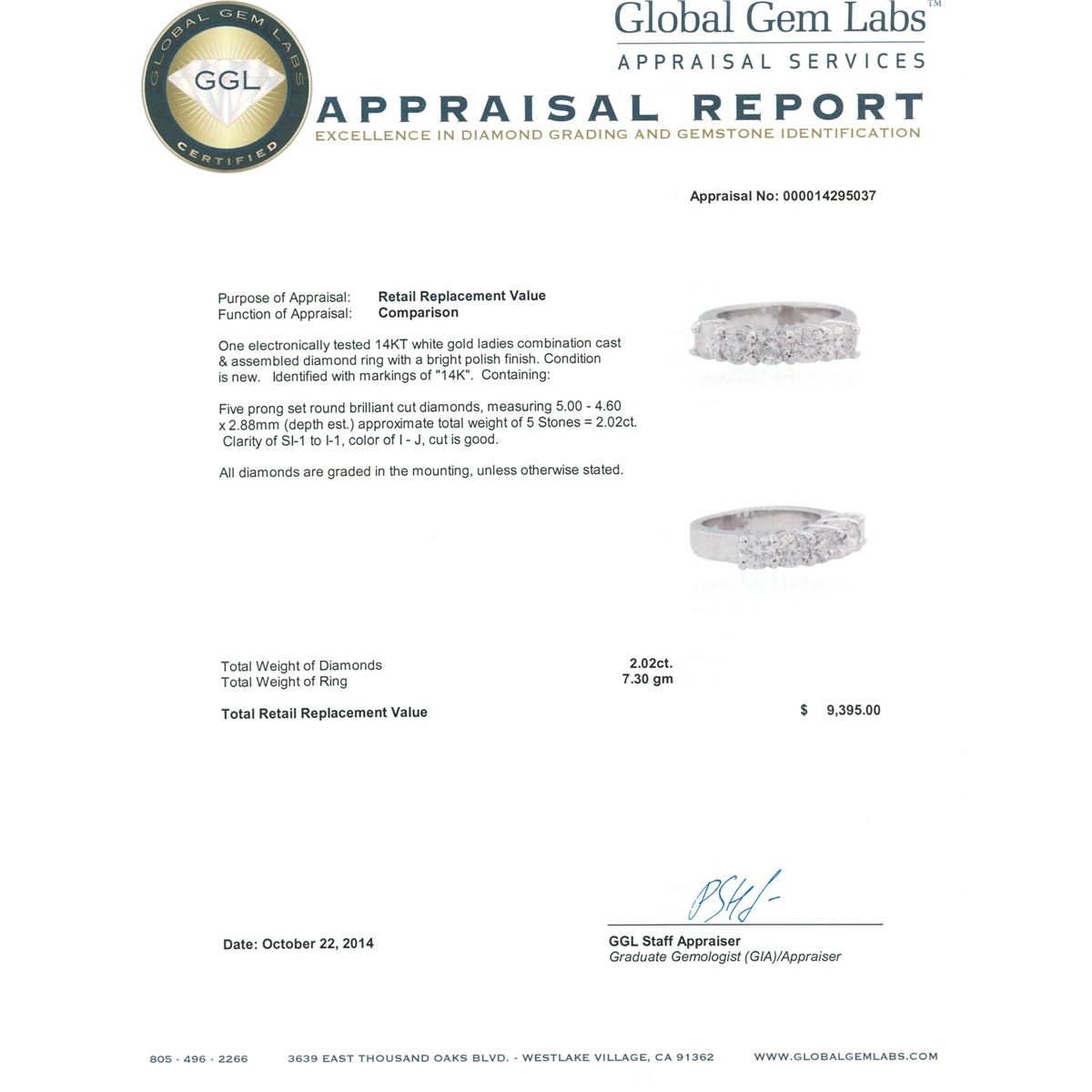 One electronically tested 14KT white gold ladies combination cast & assembled diamond ring with a bright polish finish. Identified with markings of "14K". Condition is new. Containing: Five prong set round brilliant cut diamonds, measuring 5.00 - 4.60 x 2.88mm (depth est.) approximate total weight of 5 Stones = 2.02ct. Clarity: SI-1 to I-1. Color: I - J, Cut is Good. All diamonds are graded in the mounting, unless otherwise stated. Total Weight of Diamonds 2.02ct. Total Weight of Ring 7.30 grams. GGL Appraised at $9,395.00.
