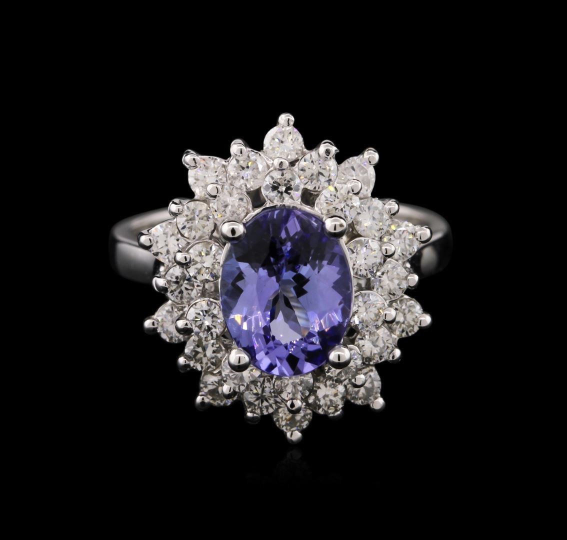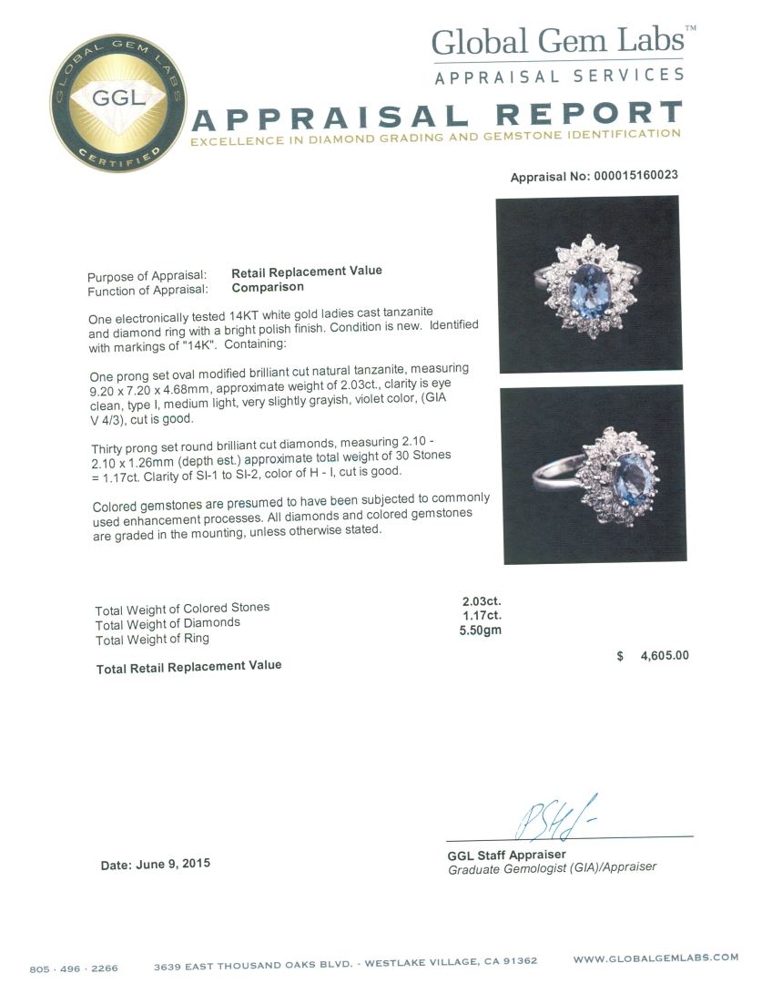 One electronically tested 14KT white gold ladies cast tanzanite and diamond ring with a bright polish finish. Identified with markings of "14K". Condition is new. Containing: One prong set oval modified brilliant cut natural tanzanite, measuring 9.20 x 7.20 x 4.68mm, approximate weight of 2.03ct., clarity is eye clean, type I, medium light, very slightly grayish, violet color, (GIA V 4/3), cut is good. Thirty prong set round brilliant cut diamonds, measuring 2.10 - 2.10 x 1.26mm (depth est.) approximate total weight of 30 Stones = 1.17ct. Clarity: SI-1 to SI-2. Color: H - I, Cut is Good. Colored gemstones are presumed to have been subjected to commonly used enhancement processes. All diamonds and colored gemstones are graded in the mounting, unless otherwise stated. Total Weight of Colored Stones 2.03ct. Total Weight of Diamonds 1.17ct. Total Weight of Ring 5.50 grams. GGL Appraised at $4,605.00.
