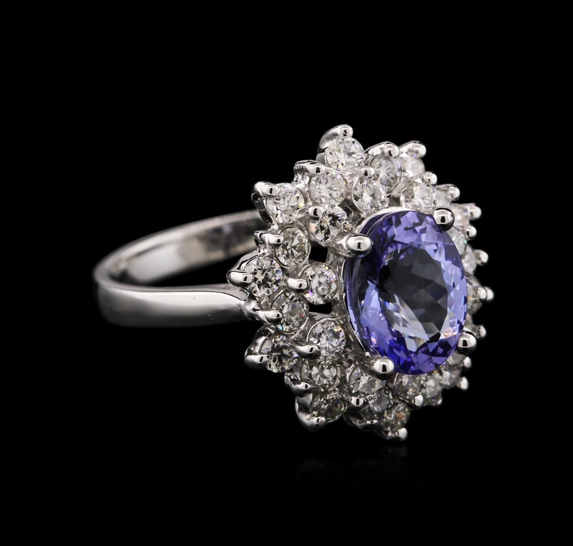 One electronically tested 14KT white gold ladies cast tanzanite and diamond ring with a bright polish finish. Identified with markings of "14K". Condition is new. Containing: One prong set oval modified brilliant cut natural tanzanite, measuring 9.20 x 7.20 x 4.68mm, approximate weight of 2.03ct., clarity is eye clean, type I, medium light, very slightly grayish, violet color, (GIA V 4/3), cut is good. Thirty prong set round brilliant cut diamonds, measuring 2.10 - 2.10 x 1.26mm (depth est.) approximate total weight of 30 Stones = 1.17ct. Clarity: SI-1 to SI-2. Color: H - I, Cut is Good. Colored gemstones are presumed to have been subjected to commonly used enhancement processes. All diamonds and colored gemstones are graded in the mounting, unless otherwise stated. Total Weight of Colored Stones 2.03ct. Total Weight of Diamonds 1.17ct. Total Weight of Ring 5.50 grams. GGL Appraised at $4,605.00.