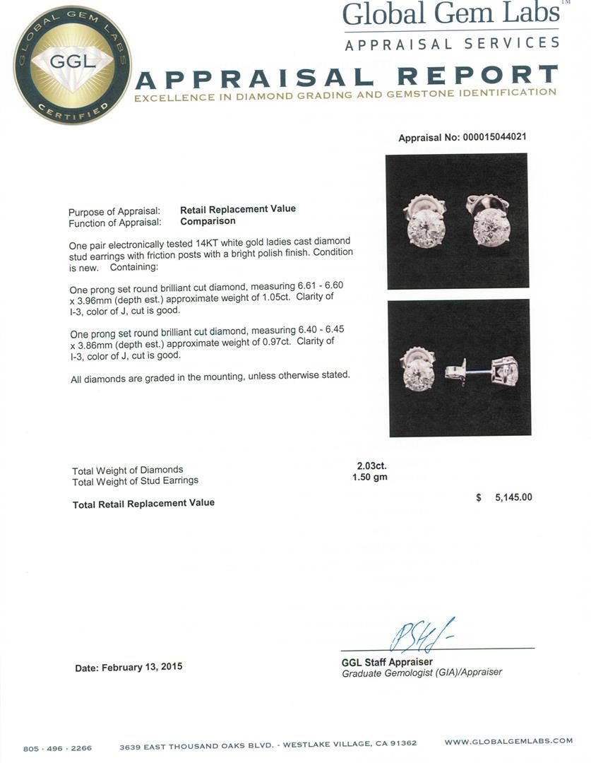 One pair electronically tested 14KT white gold ladies cast diamond stud earrings with friction posts with a bright polish finish. Condition is new. Containing: One prong set round brilliant cut diamond, measuring 6.61 - 6.60 x 3.96mm (depth est.) approximate weight of 1.05ct. Clarity: I-3. Color: J, Cut is Good. One prong set round brilliant cut diamond, measuring 6.40 - 6.45 x 3.86mm (depth est.) approximate weight of 0.97ct. Clarity: I-3. Color: J, Cut is Good. All diamonds are graded in the mounting, unless otherwise stated. Total Weight of Diamonds 2.03ct. Total Weight of Stud Earrings 1.50 grams. GGL Appraised at $5,145.00.