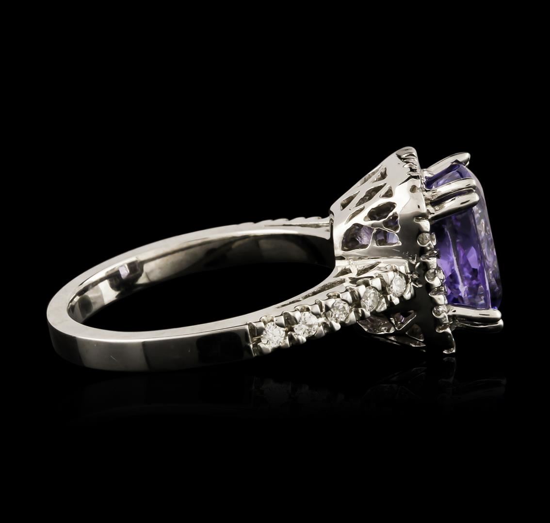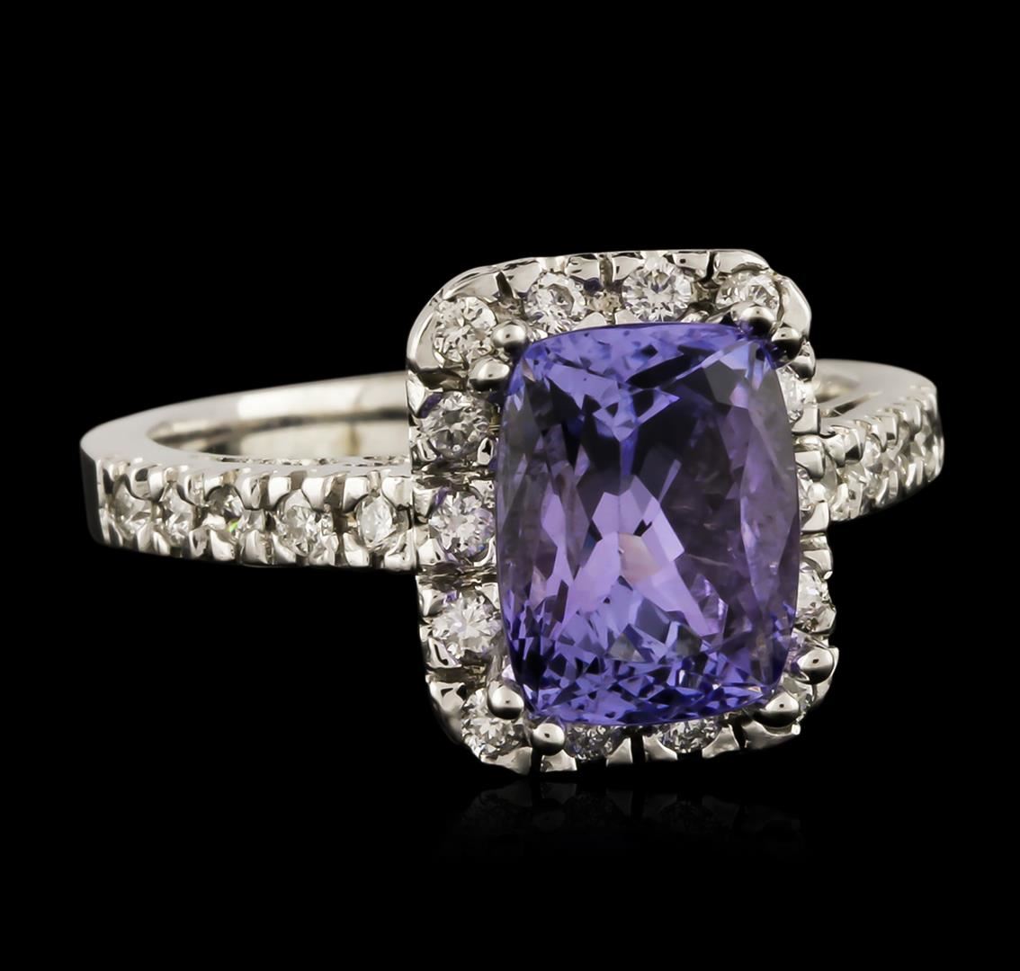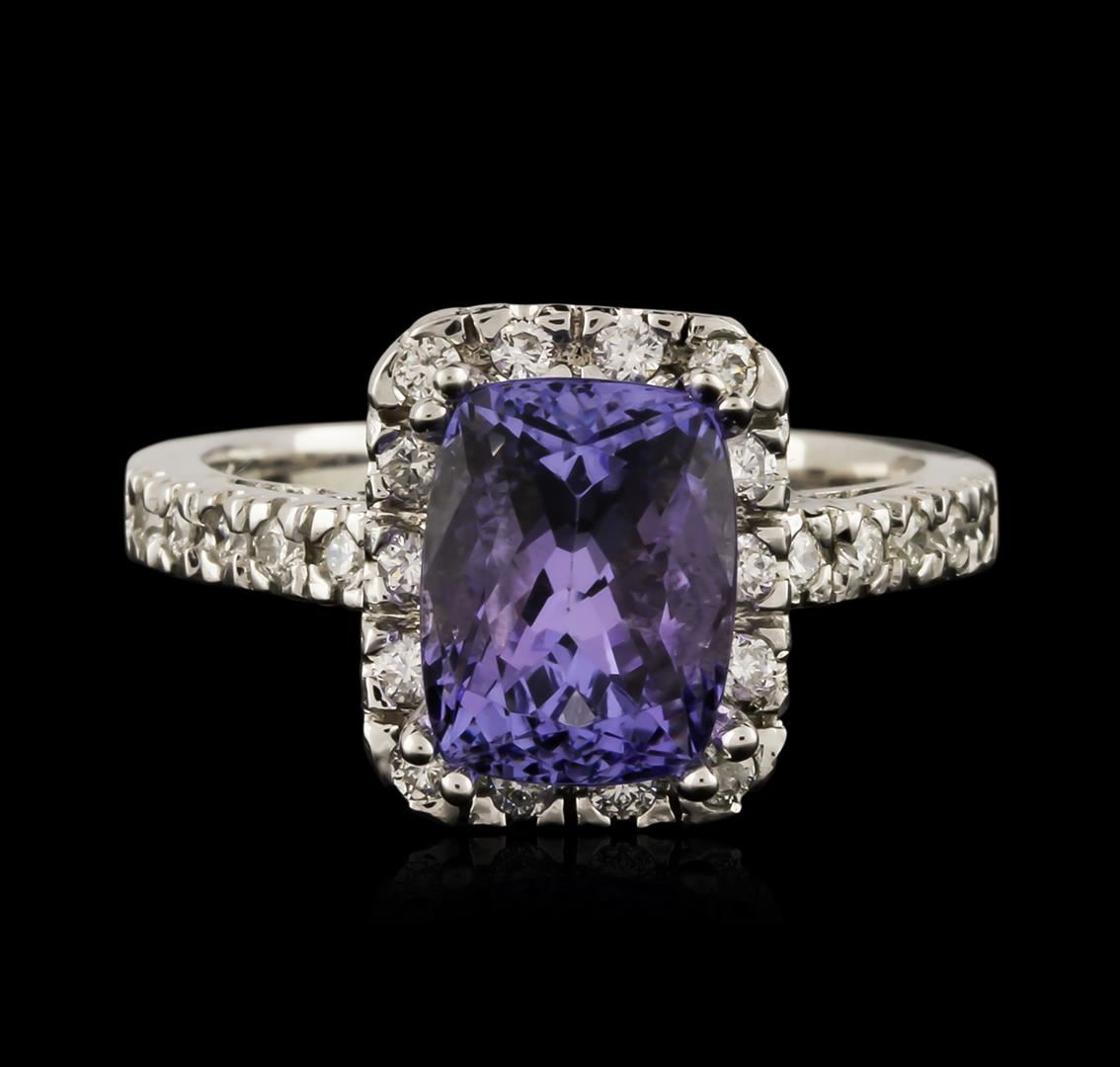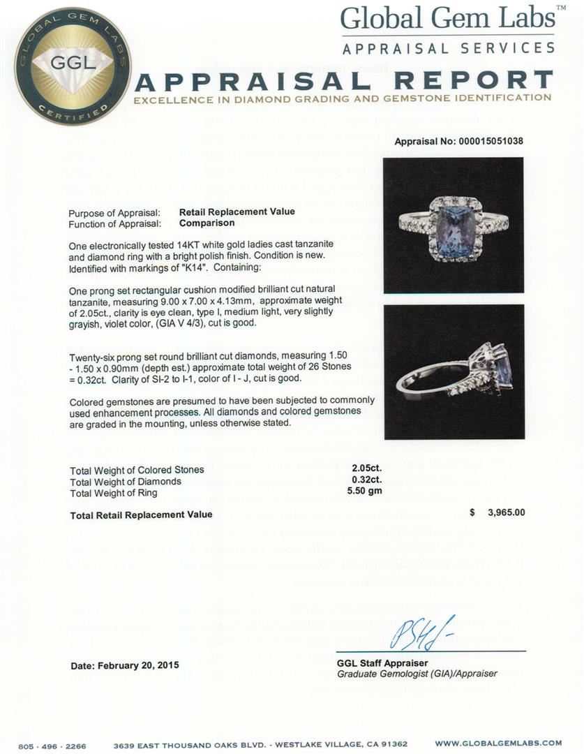 One electronically tested 14KT white gold ladies cast tanzanite and diamond ring with a bright polish finish. Identified with markings of "K14". Condition is new. Containing: One prong set rectangular cushion modified brilliant cut natural tanzanite, measuring 9.00 x 7.00 x 4.13mm, approximate weight of 2.05ct., clarity is eye clean, type I, medium light, very slightly grayish, violet color, (GIA V 4/3), cut is good. Twenty-Six prong set round brilliant cut diamonds, measuring 1.50 - 1.50 x 0.90mm (depth est.) approximate total weight of 26 Stones = 0.32ct. Clarity: SI-2 to I-1. Color: I - J, Cut is Good. Colored gemstones are presumed to have been subjected to commonly used enhancement processes. All diamonds and colored gemstones are graded in the mounting, unless otherwise stated. Total Weight of Colored Stones 2.05ct. Total Weight of Diamonds 0.32ct. Total Weight of Ring 5.50 grams. GGL Appraised at $3,965.00.