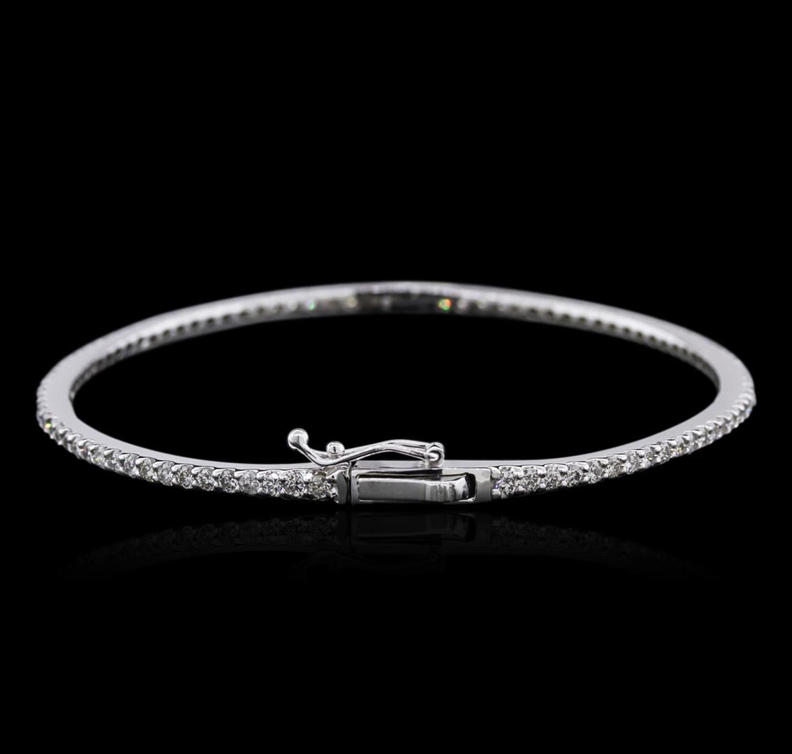 One electronically tested 14KT white gold ladies combination cast & assembled diamond bangle bracelet with a hidden box clasp with safety closer with a bright polish finish. The inside diameter of the bracelet is 2-1/4" wide Identified with markings of "K14". Condition is new. Containing: Ninety prong set round brilliant cut diamonds, measuring 1.80 - 1.80 x 1.08mm (depth est.) exact total weight 90 Stones = 2.05ct. Clarity: SI-1 to SI-2. Color: I - K, Cut is Good. All diamonds are graded in the mounting, unless otherwise stated. Total Weight of Diamonds 2.05ct. Total Weight of Bangle Bracelet 8.60 grams. GGL Appraised at $4,250.00.