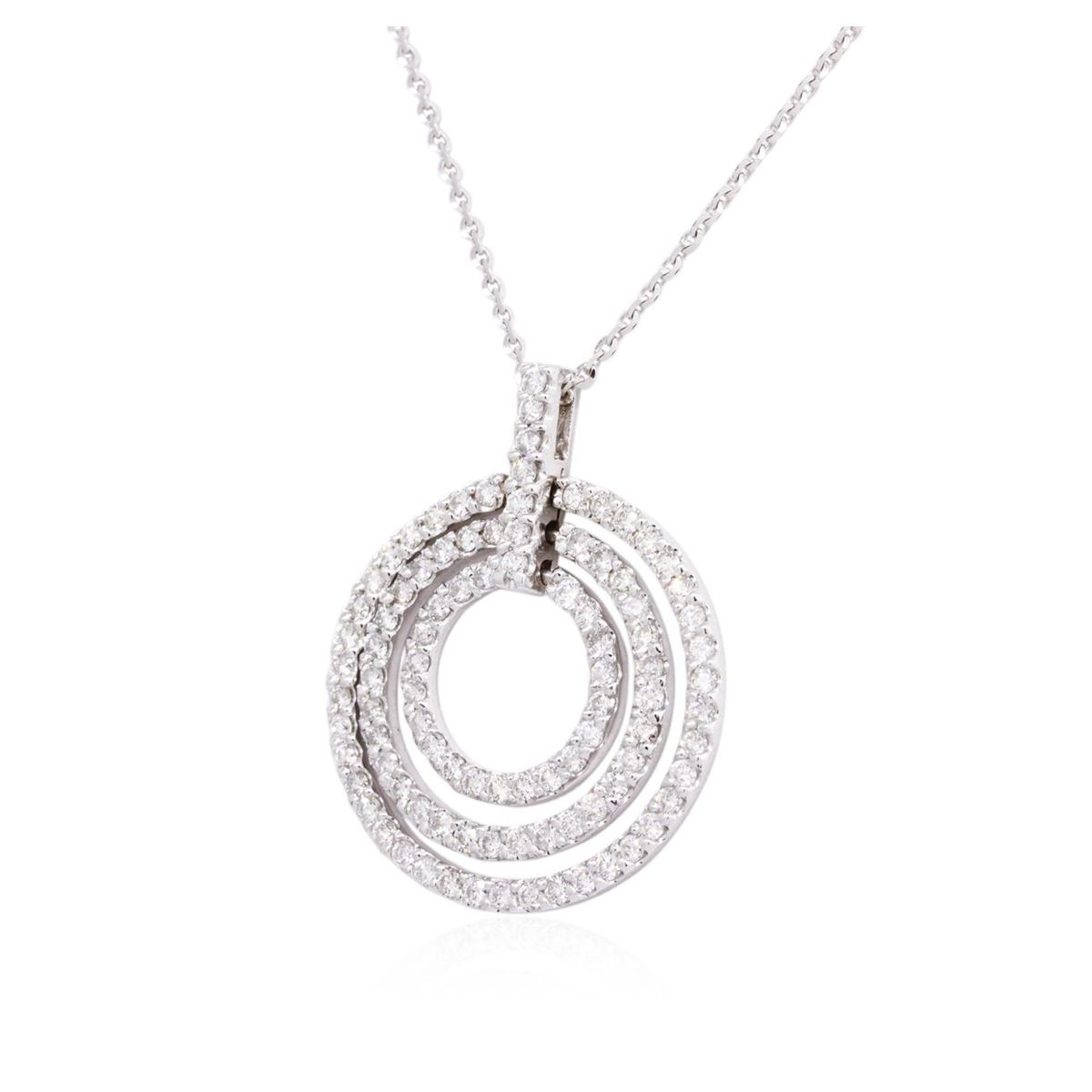 One electronically tested 14KT white gold ladies combination cast & assembled diamond pendant & chain 18.0" long, cable link with a lobster claw clasp with a bright polish finish. Identified with markings of "14K". Condition is new. Containing: Ninety-Six prong set round brilliant cut diamonds, measuring 1.80 - 1.80 x 1.08mm (depth est.) approximate total weight of 96 Stones = 2.05ct. Clarity: SI-2 to I-1. Color: J - K, Cut is Good. All diamonds are graded in the mounting, unless otherwise stated. Total Weight of Diamonds 2.05ct. Total Weight of Pendant & Chain 9.50 grams. GGL Appraised at $7,120.00.