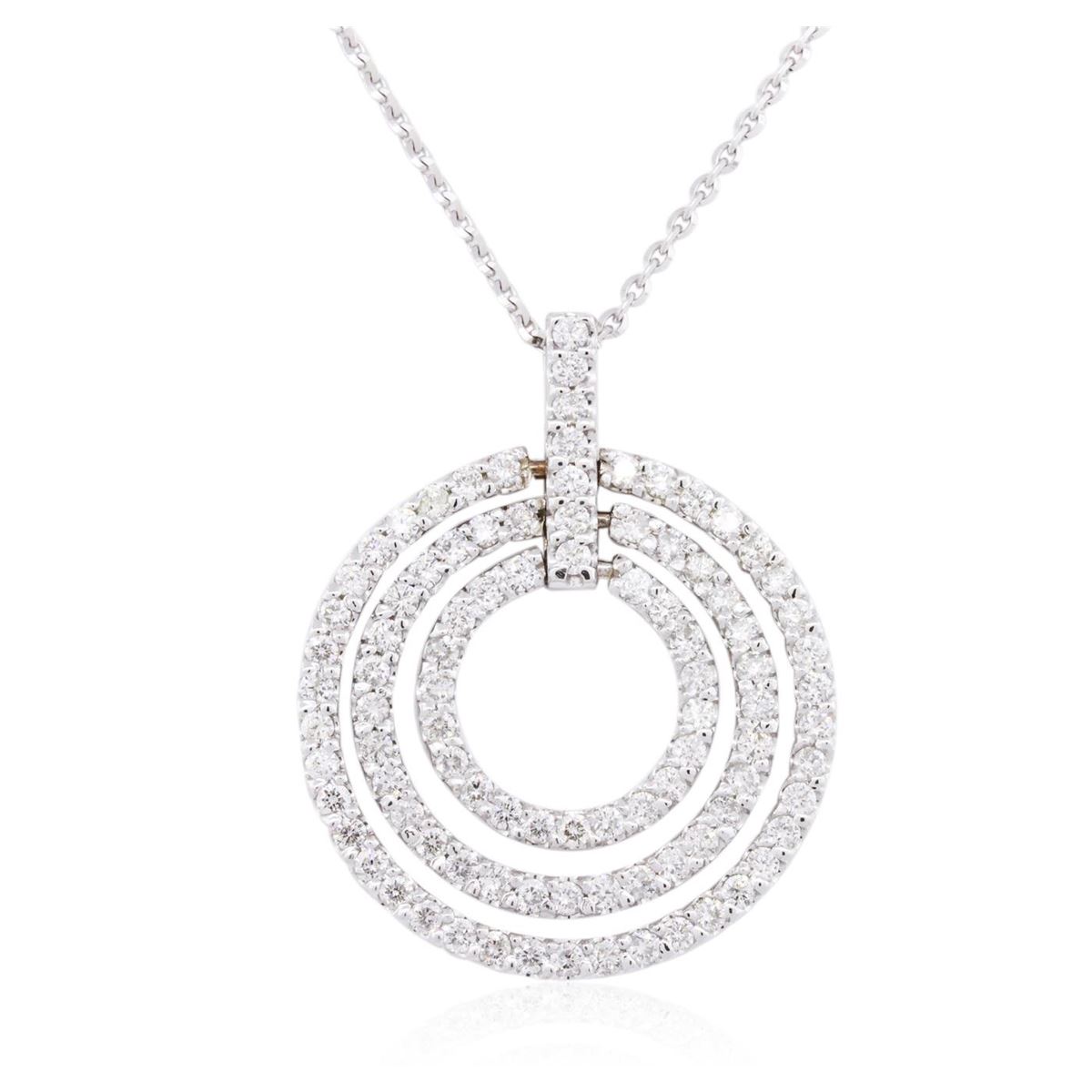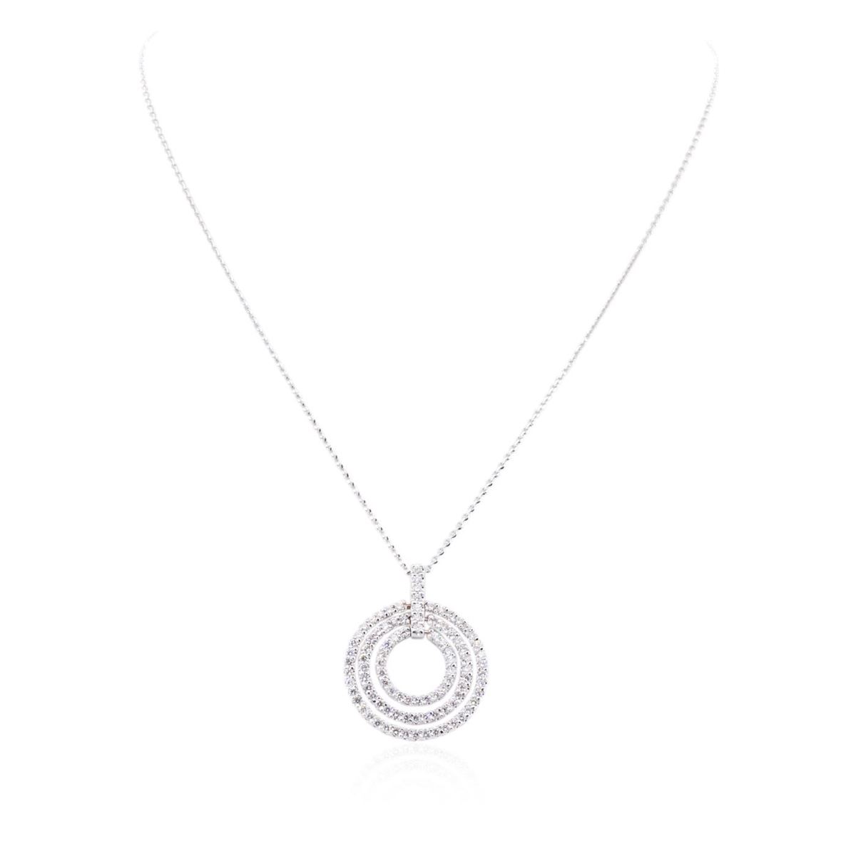 One electronically tested 14KT white gold ladies combination cast & assembled diamond pendant & chain 18.0" long, cable link with a lobster claw clasp with a bright polish finish. Identified with markings of "14K". Condition is new. Containing: Ninety-Six prong set round brilliant cut diamonds, measuring 1.80 - 1.80 x 1.08mm (depth est.) approximate total weight of 96 Stones = 2.05ct. Clarity: SI-2 to I-1. Color: J - K, Cut is Good. All diamonds are graded in the mounting, unless otherwise stated. Total Weight of Diamonds 2.05ct. Total Weight of Pendant & Chain 9.50 grams. GGL Appraised at $7,120.00.