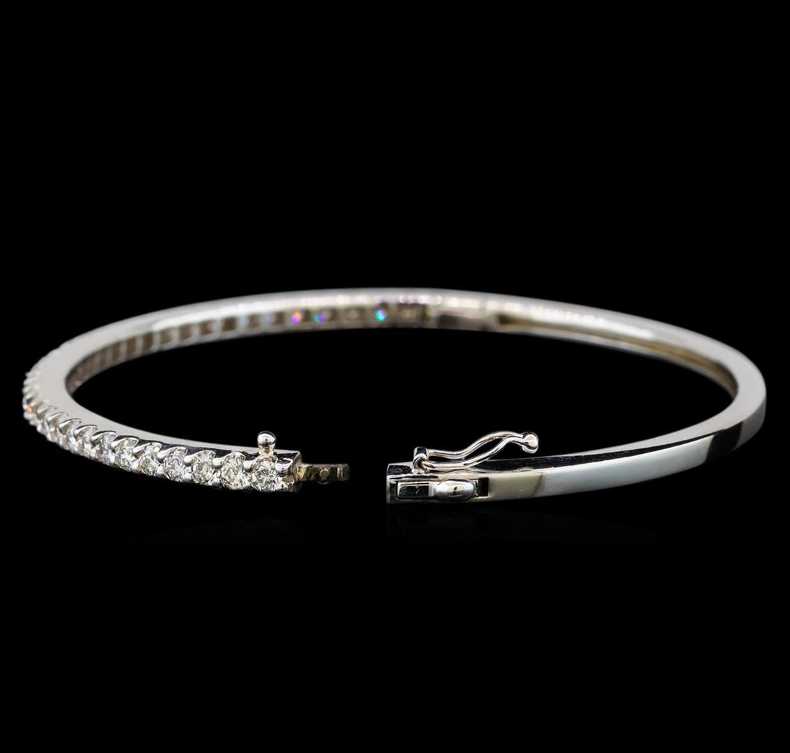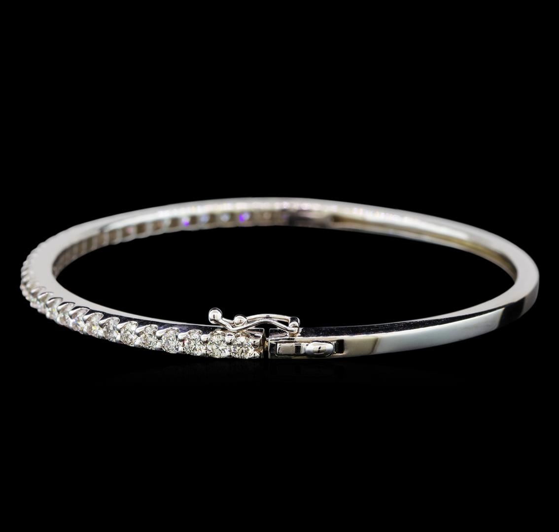 One electronically tested 14KT white gold ladies cast diamond bangle bracelet with a hidden box clasp with safety closer with a bright polish finish. Condition is new. Containing: Thirty-Six prong set round brilliant cut diamonds, measuring 2.50 - 2.50 x 1.50mm (depth est.) approximate total weight of 36 Stones = 2.06ct. Clarity: SI-1 to I-1. Color: H - J, Cut is Good. All diamonds are graded in the mounting, unless otherwise stated. Total Weight of Diamonds 2.06ct. Total Weight of Bangle Bracelet 12.50 grams. GGL Appraised at $6,465.00.