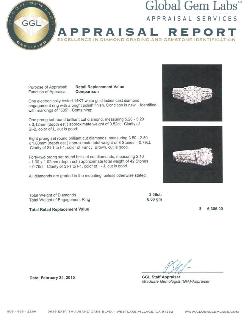 One electronically tested 14KT white gold ladies cast diamond engagement ring with a bright polish finish. Identified with markings of "585". Condition is new. Containing: One prong set round brilliant cut diamond, measuring 5.20 - 5.20 x 3.12mm (depth est.) approximate weight of 0.52ct. Clarity: SI-2. Color: L, Cut is Good. Eight prong set round brilliant cut diamonds, measuring 3.50 - 2.50 x 1.80mm (depth est.) approximate total weight of 8 Stones = 0.79ct. Clarity: SI-1 to I-1, Cut is Good. Forty-Two prong set round brilliant cut diamonds, measuring 2.10 - 1.30 x 1.02mm (depth est.) approximate total weight of 42 Stones = 0.75ct. Clarity: SI-1 to I-1. Color: I - J, Cut is Good. All diamonds are graded in the mounting, unless otherwise stated. Total Weight of Diamonds 2.06ct. Total Weight of Engagement Ring 6.60 grams. GGL Appraised at $6,305.00.