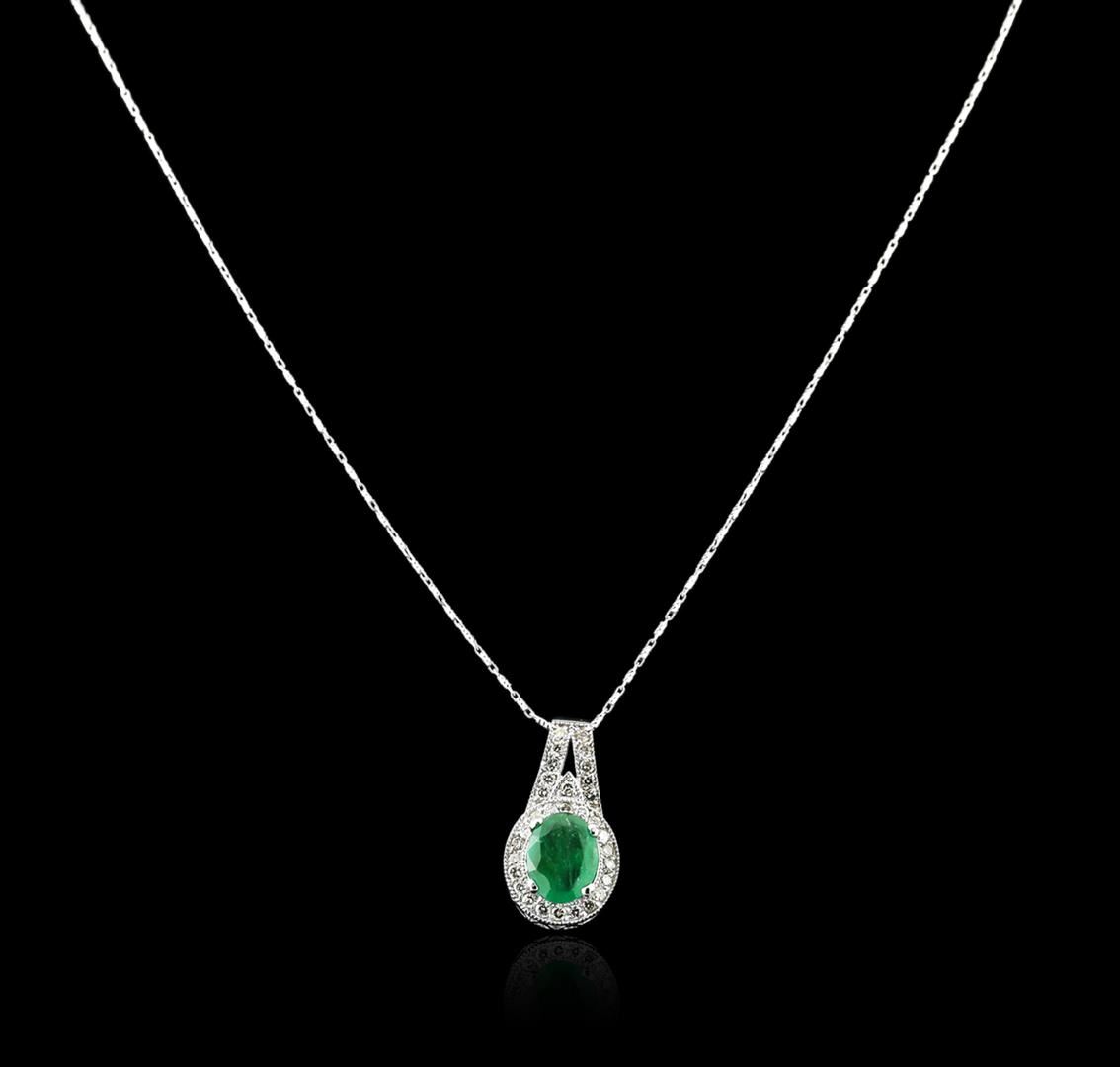 One electronically tested 14KT white gold ladies cast emerald and diamond pendant & chain 18.0" long, thin diamond cut link with a lobster claw clasp with a bright polish finish. Identified with markings of "K14". Condition is new. Containing: One prong set oval modified brilliant cut natural emerald, measuring 11.14 x 8.57 x 3.78mm, approximate weight of 2.06ct., clarity is heavily included, type III, light, very slightly grayish, green color, (GIA G 3/3), cut is good. Thirty-One prong set round brilliant cut diamonds, measuring 1.60 - 1.60 x 0.96mm (depth est.) approximate total weight of 31 Stones = 0.46ct. Clarity: SI-1 to SI-2. Color: L - M, Cut is Good. Diamonds and colored gemstones are graded in the mounting, unless otherwise stated. Colored gemstones are presumed to have been subjected to commonly used enhancement processes. Total Weight of Colored Stones 2.06ct. Total Weight of Diamonds 0.46ct. Total Weight of Pendant & Chain 7.30 grams. GGL Appraised at $3,180.00.