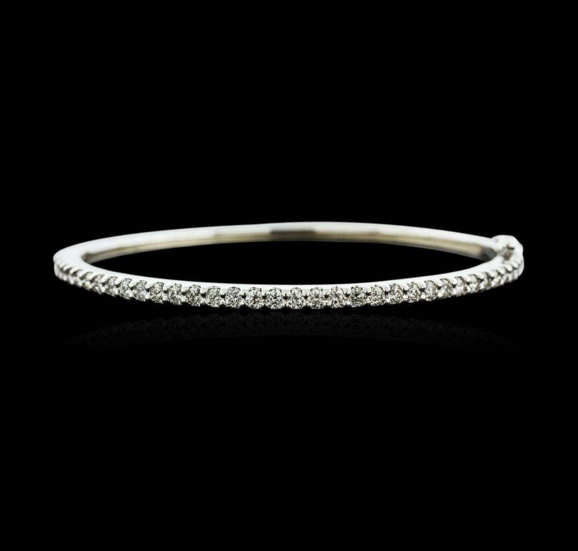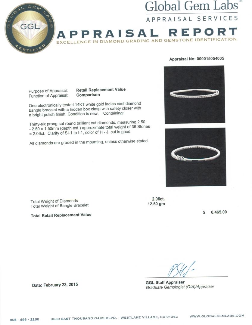 One electronically tested 14KT white gold ladies cast diamond bangle bracelet with a hidden box clasp with safety closer with a bright polish finish. Condition is new. Containing: Thirty-Six prong set round brilliant cut diamonds, measuring 2.50 - 2.50 x 1.50mm (depth est.) approximate total weight of 36 Stones = 2.06ct. Clarity: SI-1 to I-1. Color: H - J, Cut is Good. All diamonds are graded in the mounting, unless otherwise stated. Total Weight of Diamonds 2.06ct. Total Weight of Bangle Bracelet 12.50 grams. GGL Appraised at $6,465.00.