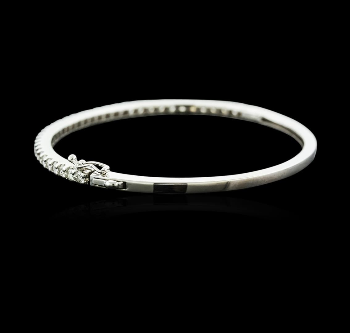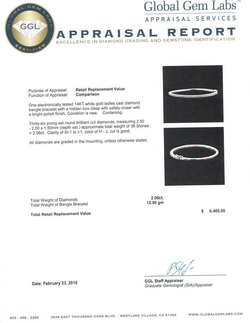 One electronically tested 14KT white gold ladies cast diamond bangle bracelet with a hidden box clasp with safety closer with a bright polish finish. Condition is new. Containing: Thirty-Six prong set round brilliant cut diamonds, measuring 2.50 - 2.50 x 1.50mm (depth est.) approximate total weight of 36 Stones = 2.06ct. Clarity: SI-1 to I-1. Color: H - J, Cut is Good. All diamonds are graded in the mounting, unless otherwise stated. Total Weight of Diamonds 2.06ct. Total Weight of Bangle Bracelet 12.50 grams. GGL Appraised at $6,465.00.
