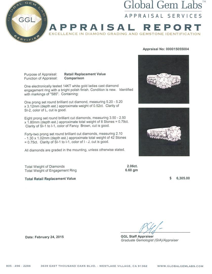 One electronically tested 14KT white gold ladies cast diamond engagement ring with a bright polish finish. Identified with markings of "585". Condition is new. Containing: One prong set round brilliant cut diamond, measuring 5.20 - 5.20 x 3.12mm (depth est.) approximate weight of 0.52ct. Clarity: SI-2. Color: L, Cut is Good. Eight prong set round brilliant cut diamonds, measuring 3.50 - 2.50 x 1.80mm (depth est.) approximate total weight of 8 Stones = 0.79ct. Clarity: SI-1 to I-1, Cut is Good. Forty-Two prong set round brilliant cut diamonds, measuring 2.10 - 1.30 x 1.02mm (depth est.) approximate total weight of 42 Stones = 0.75ct. Clarity: SI-1 to I-1. Color: I - J, Cut is Good. All diamonds are graded in the mounting, unless otherwise stated. Total Weight of Diamonds 2.06ct. Total Weight of Engagement Ring 6.60 grams. GGL Appraised at $6,305.00.