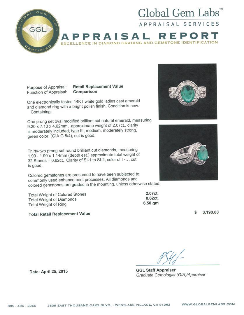 One electronically tested 14KT white gold ladies cast emerald and diamond ring with a bright polish finish. Condition is new. Containing: One prong set oval modified brilliant cut natural emerald, measuring 9.20 x 7.10 x 4.62mm, approximate weight of 2.07ct., clarity is moderately included, type III, medium, moderately strong, green color, (GIA G 5/4), cut is good. Thirty-Two prong set round brilliant cut diamonds, measuring 1.90 - 1.90 x 1.14mm (depth est.) approximate total weight of 32 Stones = 0.62ct. Clarity: SI-1 to SI-2. Color: I - J, Cut is Good. Colored gemstones are presumed to have been subjected to commonly used enhancement processes. All diamonds and colored gemstones are graded in the mounting, unless otherwise stated. Total Weight of Colored Stones 2.07ct. Total Weight of Diamonds 0.62ct. Total Weight of Ring 6.50 grams. GGL Appraised at $3,190.00.