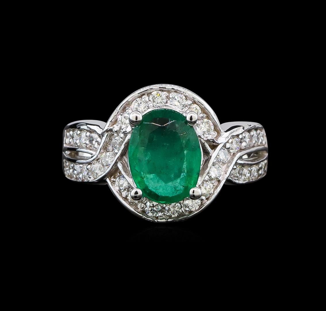 One electronically tested 14KT white gold ladies cast emerald and diamond ring with a bright polish finish. Condition is new. Containing: One prong set oval modified brilliant cut natural emerald, measuring 9.20 x 7.10 x 4.62mm, approximate weight of 2.07ct., clarity is moderately included, type III, medium, moderately strong, green color, (GIA G 5/4), cut is good. Thirty-Two prong set round brilliant cut diamonds, measuring 1.90 - 1.90 x 1.14mm (depth est.) approximate total weight of 32 Stones = 0.62ct. Clarity: SI-1 to SI-2. Color: I - J, Cut is Good. Colored gemstones are presumed to have been subjected to commonly used enhancement processes. All diamonds and colored gemstones are graded in the mounting, unless otherwise stated. Total Weight of Colored Stones 2.07ct. Total Weight of Diamonds 0.62ct. Total Weight of Ring 6.50 grams. GGL Appraised at $3,190.00.
