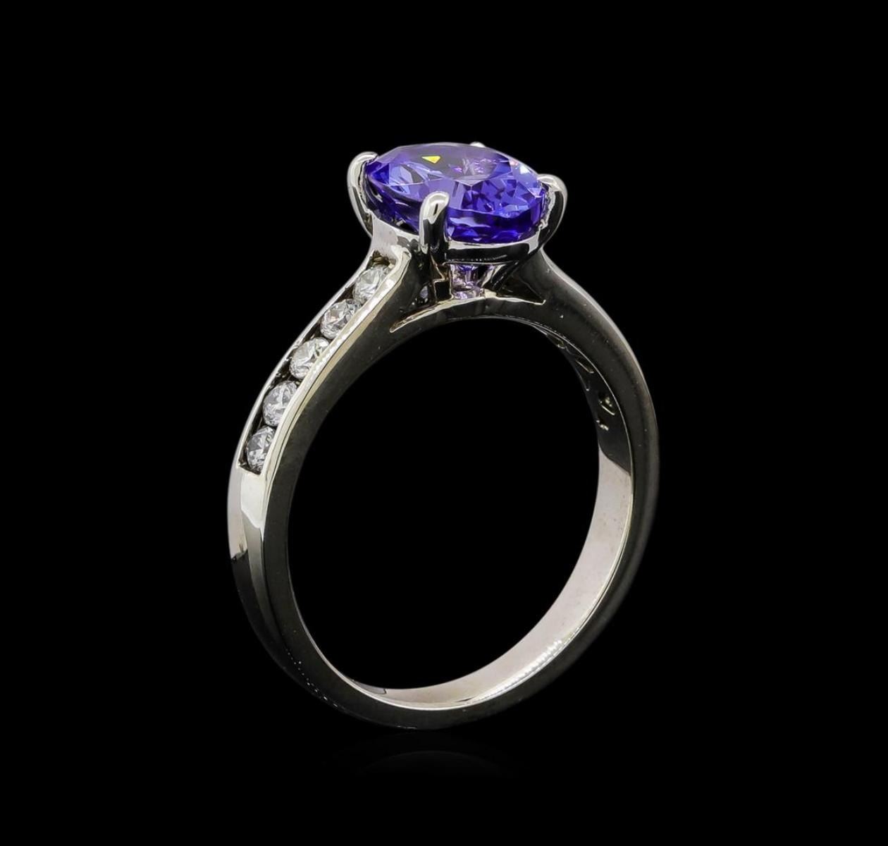 One electronically tested 14KT white gold ladies cast tanzanite and diamond ring. Identified with markings of "14K". Condition is new. Containing: One prong set oval modified brilliant cut natural tanzanite, measuring 9.00 x 7.00 x 4.55mm, approximate weight of 2.07ct., clarity is eye clean, type I, medium light, very slightly grayish, violet color, (GIA V 4/3), cut is good. Ten channel set round brilliant cut diamonds, measuring 2.00 - 2.00 x 1.20mm (depth est.) approximate total weight of 10 Stones = 0.32ct. Clarity: SI-1 to SI-2. Color: I - J, Cut is Good. Colored gemstones are presumed to have been subjected to commonly used enhancement processes. All diamonds and colored gemstones are graded in the mounting, unless otherwise stated. Total Weight of Colored Stones 2.07ct. Total Weight of Diamonds 0.32ct. Total Weight of Ring 3.70 grams. GGL Appraised.