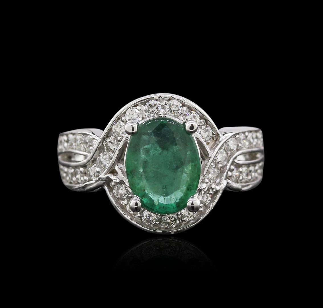 One electronically tested 14KT white gold ladies cast emerald and diamond ring with a bright polish finish. Condition is new. Containing: One prong set oval modified brilliant cut natural emerald, measuring 9.20 x 7.10 x 4.62mm, approximate weight of 2.07ct., clarity is moderately included, type III, medium, moderately strong, green color, (GIA G 5/4), cut is good. Thirty-Two prong set round brilliant cut diamonds, measuring 1.90 - 1.90 x 1.14mm (depth est.) approximate total weight of 32 Stones = 0.62ct. Clarity: SI-1 to SI-2. Color: I - J, Cut is Good. Colored gemstones are presumed to have been subjected to commonly used enhancement processes. All diamonds and colored gemstones are graded in the mounting, unless otherwise stated. Total Weight of Colored Stones 2.07ct. Total Weight of Diamonds 0.62ct. Total Weight of Ring 6.50 grams. GGL Appraised at $3,190.00.