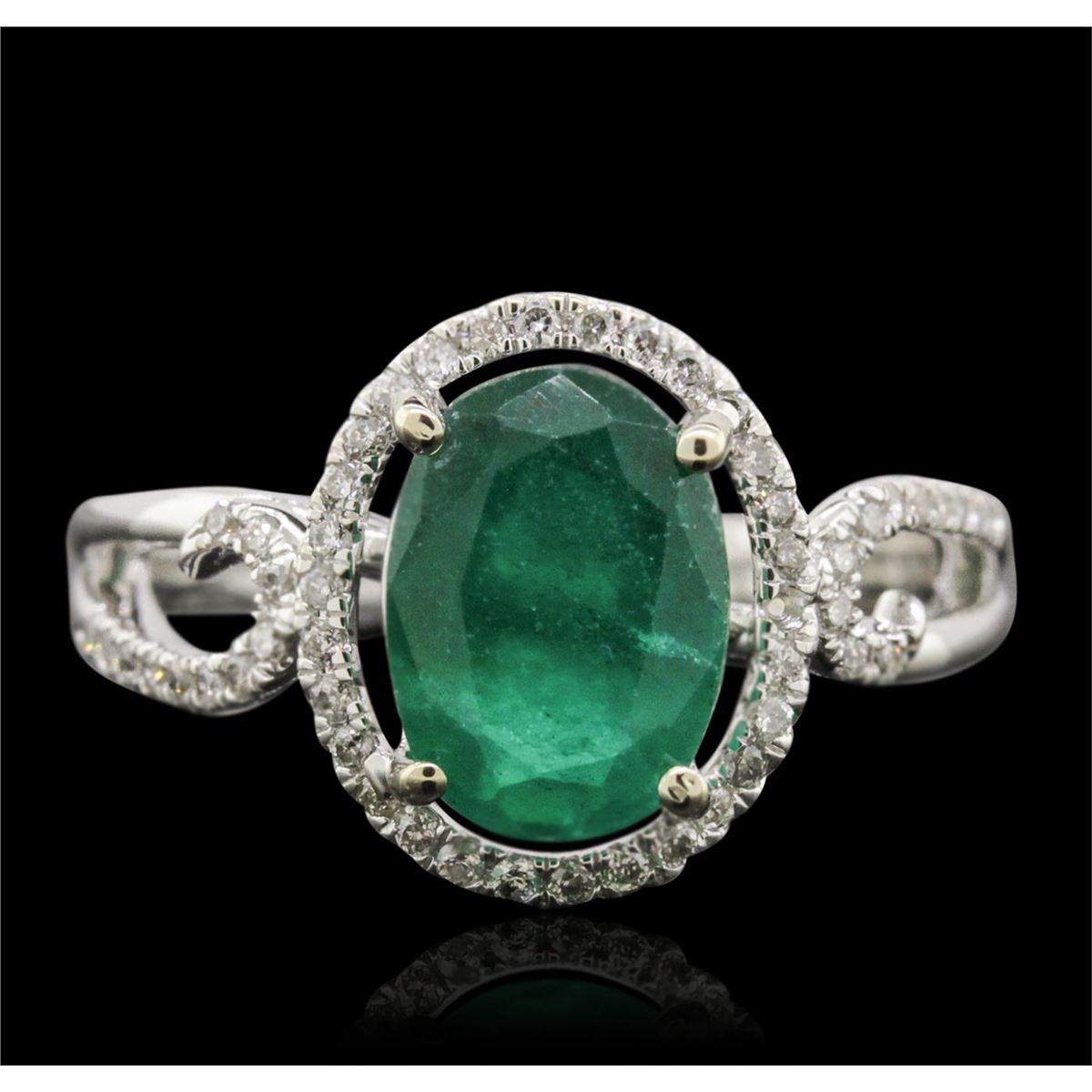 One electronically tested 14KT white gold ladies cast emerald and diamond ring with a bright polish finish. Condition is new, good workmanship. The featured emerald is set within a diamond bezel supported by diamond set shoulders, completed by a one and one-half millimeter wide band. Identified with markings of "14K". Containing: One prong set oval mixed cut natural emerald, measuring 9.85 x 7.10 x 5.00mm, 6%. bulge factor, approximate weight of 2.07ct., clarity is heavily included, type III, medium dark, moderately strong, very slightly bluish green color, (GIA vslbG 6/4), cut is good. Transmitting light somewhat diffusely, transparent to translucent. Naturally occurring internal & external characteristics are present. Indications of oil residue. Graded in the setting. Fifty-One prong set round brilliant cut diamonds, measuring 1.10 - 1.00 x 0.63mm (depth est.) approximate. Total Weight of 51 Stones = 0.31ct. Graded in the setting. Clarity: SI-1 to I-1. Color: G - I. Total Weight of Colored Stones 2.07ct. Total Weight of Diamonds 0.31ct. Total Weight of Ring 3.65 grams. AIG Appraised at $4,485.00.