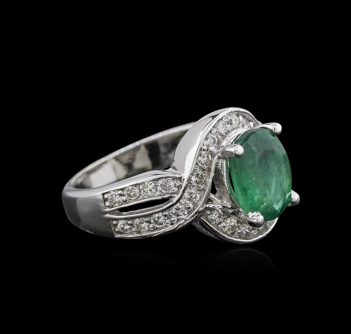 One electronically tested 14KT white gold ladies cast emerald and diamond ring with a bright polish finish. Condition is new. Containing: One prong set oval modified brilliant cut natural emerald, measuring 9.20 x 7.10 x 4.62mm, approximate weight of 2.07ct., clarity is moderately included, type III, medium, moderately strong, green color, (GIA G 5/4), cut is good. Thirty-Two prong set round brilliant cut diamonds, measuring 1.90 - 1.90 x 1.14mm (depth est.) approximate total weight of 32 Stones = 0.62ct. Clarity: SI-1 to SI-2. Color: I - J, Cut is Good. Colored gemstones are presumed to have been subjected to commonly used enhancement processes. All diamonds and colored gemstones are graded in the mounting, unless otherwise stated. Total Weight of Colored Stones 2.07ct. Total Weight of Diamonds 0.62ct. Total Weight of Ring 6.50 grams. GGL Appraised at $3,190.00.